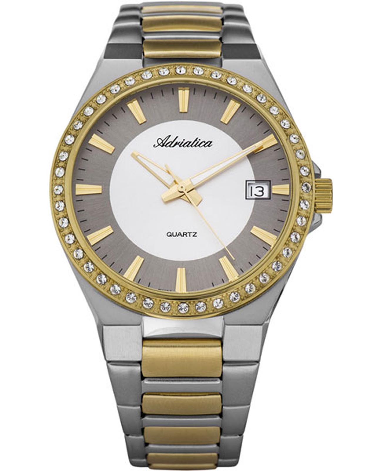 Женские швейцарские часы с минеральным стекломМинеральное стеклоМинеральное стекло представляет собой искусственно выращенный минерал кварца. Такое стекло отличается особой устойчивостью к повреждениям и царапинам. Уступает по некоторым качествам сапфировому стеклу. Adriatica A3804.2113QZ, кварцевый механизм Ronda 515, работающим от батарейки с высокой точностью.Класс водозащиты: 50 метров, позволит защитить корпус от случайных брызг или капель дождя. Корпус и браслет часов изготовлен из стали с PVD-покрытиемIP-покрытиеМетод ионного напыления. Демонстрирует повышенную устойчивость к истиранию, окислению и химическим веществам. Под воздействием высокого давления и температуры около 1500°C молекулы металла надёжно соединяются с частицами корпуса часов..Окошко даты находится в положении 3 часа.Стальной браслет на раскладной застёжкеРаскладная застёжкаТакой тип застёжки используется только на браслетах из металла. Она никогда не раскрывается полностью, происходит разделение на 2 и более частей. Раскладывающая застёжка снизит вероятность потери часов к минимуму.. Стрелки с люминесцентным покрытиемЛюминесцентное покрытиеПозволяет считывать показания времени в темноте. Производители наносят на стрелки, часовые индексы, безель или поверхность циферблата светонакопительный состав, дающий холодное свечение..БезельБезельВнешний ободок, закрепляющий стекло. В спортивных часах так называется поворотное кольцо с делениями на циферблате, выполняет роль таймера – замеряет отрезки времени на шкале. Неподвижный безель – элемент декора. Однонаправленно вращающийся безель на дайверских часах позволяет фиксировать моменты погружения и выныривания на поверхность. с PVD-покрытиемPVDУльтратонкое покрытие наносится в технике вакуумного напыления, сочетает в себе нитрид титана особой прочности со слоем золота или оксида хрома. Несёт в себе декоративную или защитную функцию. инкрустирован цирконами.