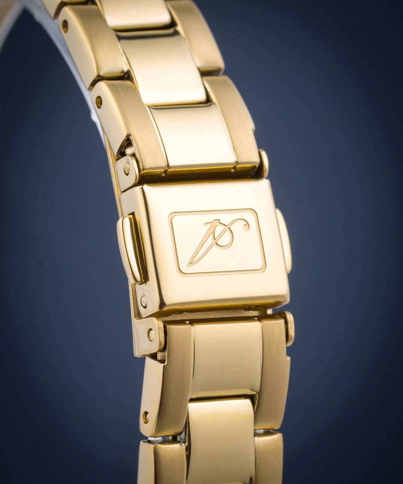 Женские часы Adriatica Essence A3818.1111Q имеют кварцевый механизм с высокой точностью. Минеральное стеклоМинеральное стеклоМинеральное стекло представляет собой искусственно выращенный минерал кварца. Такое стекло отличается особой устойчивостью к повреждениям и царапинам. Уступает по некоторым качествам сапфировому стеклу. обеспечивает надежную защиту золотистого циферблата, который украшен кристаллами. Корпус часов изготовлен из нержавеющей стали с золотистым PVDPVDУльтратонкое покрытие наносится в технике вакуумного напыления, сочетает в себе нитрид титана особой прочности со слоем золота или оксида хрома. Несёт в себе декоративную или защитную функцию. покрытием, что придает часам утонченный и стильный вид.  Браслет из нержавеющей стали с золотистым PVDPVDУльтратонкое покрытие наносится в технике вакуумного напыления, сочетает в себе нитрид титана особой прочности со слоем золота или оксида хрома. Несёт в себе декоративную или защитную функцию. покрытием и раскладной застёжкойРаскладная застёжкаТакой тип застёжки используется только на браслетах из металла. Она никогда не раскрывается полностью, происходит разделение на 2 и более частей. Раскладывающая застёжка снизит вероятность потери часов к минимуму., гармонично дополняет общий дизайн и обеспечивает комфортное ношение на запястье. Надежный кварцевый механизм с калибром RONDA 763 гарантирует точность времени, а водозащита WR 30 (3 ATM) делает эти часы практичным выбором для повседневного использования.