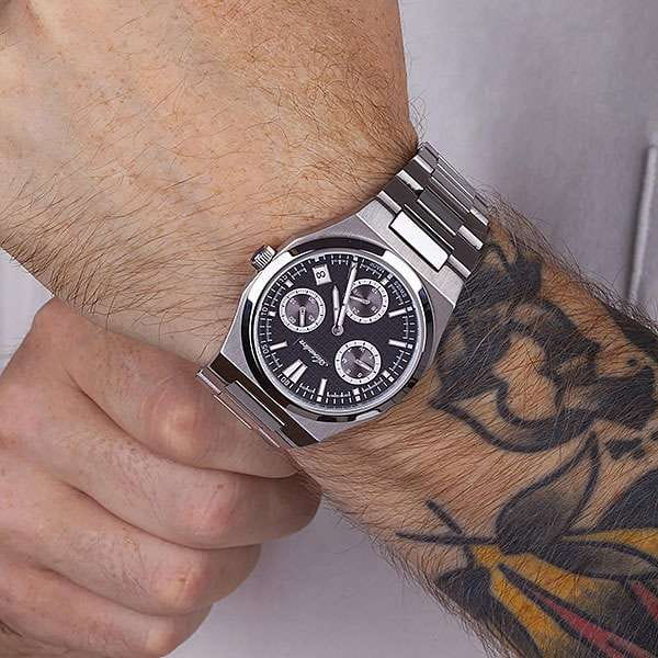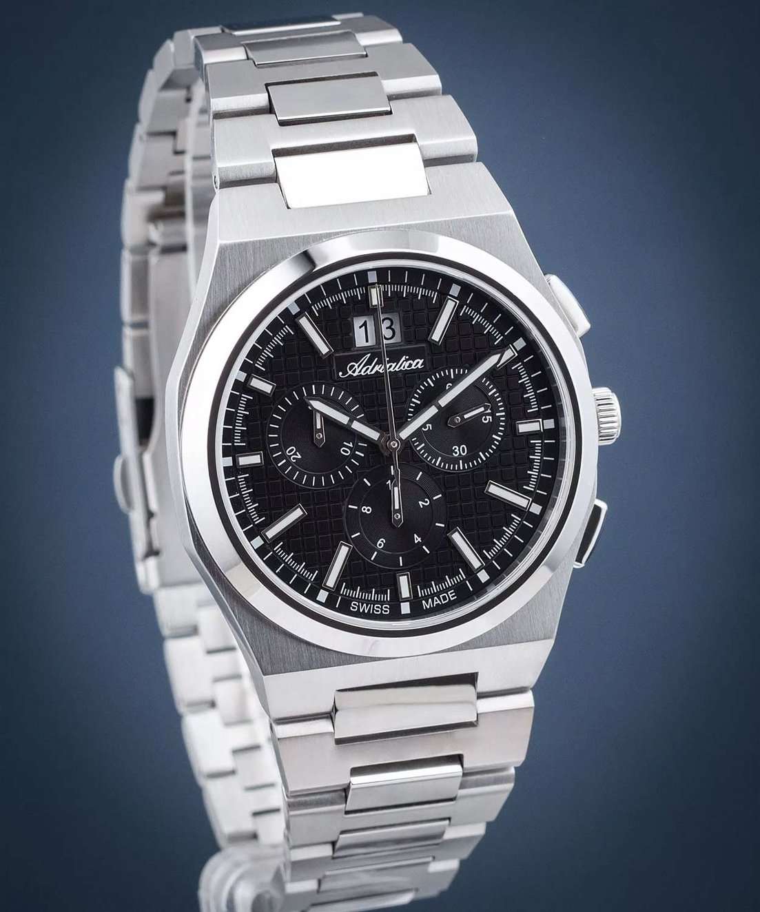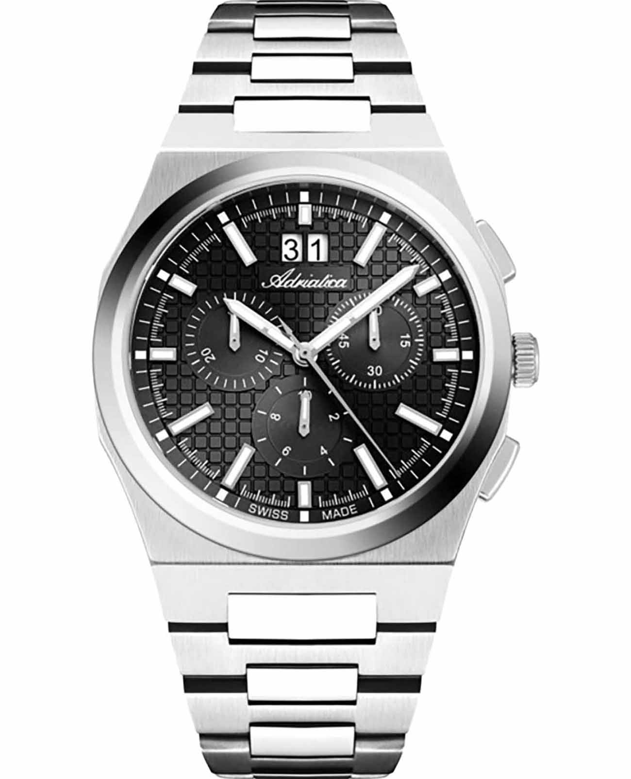 Мужские швейцарские часы-хронографХронографФункция позволяет измерять отрезки времени с особой точностью: часы, минуты, секунды. Верным признаком хронографа является наличие на циферблате 3 дополнительных окошек-счётчиков. с секундомеромСекундомерСекундоме́р — прибор, способный измерять интервалы времени с точностью до долей секунды. Adriatica Premiere A8326.5114CH воплощают в себе элегантность и функциональность, идеально подходящие для современных мужчин, ценящих швейцарское качество. Их черный циферблат защищенный сапфировым стекломСапфировое стеклоПрочный и надёжный материал из кристалла сапфира синтетического происхождения, характеризующийся особой твёрдостью и устойчивостью к царапинам и повреждениям., заключен в корпус из нержавеющей стали диаметром 40 мм и толщиной 10 мм. Надежный кварцевый механизм с калибром Ronda 5040.B обеспечивает высокую точность, а водозащита 5 ATM делает часы устойчивыми к воздействию воды. Стальной браслет с раскладной застёжкойРаскладная застёжкаТакой тип застёжки используется только на браслетах из металла. Она никогда не раскрывается полностью, происходит разделение на 2 и более частей. Раскладывающая застёжка снизит вероятность потери часов к минимуму. обеспечивает комфортное и надежное ношение. Фактурный циферблат с метками в виде штрихов дополнен рисунком в клетку, а окошко даты находится в положении 12 часов, что добавляет практичности в повседневной жизни. Люминесцентное покрытиеЛюминесцентное покрытиеПозволяет считывать показания времени в темноте. Производители наносят на стрелки, часовые индексы, безель или поверхность циферблата светонакопительный состав, дающий холодное свечение. на стрелках и метках обеспечивает отличную видимость в темноте.