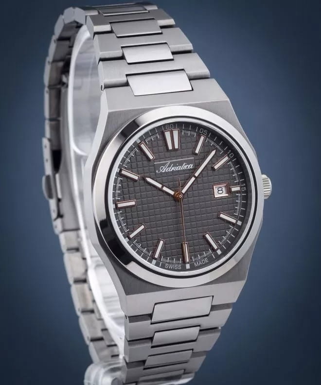 Часы Adriatica A8326.S1R6Q воплощают в себе элегантность и функциональность, идеально подходящие для современных мужчин, ценящих швейцарское качество. Их черный циферблат защищенный сапфировым стекломСапфировое стеклоПрочный и надёжный материал из кристалла сапфира синтетического происхождения, характеризующийся особой твёрдостью и устойчивостью к царапинам и повреждениям., заключен в черный корпус с безелемБезельВнешний ободок, закрепляющий стекло. В спортивных часах так называется поворотное кольцо с делениями на циферблате, выполняет роль таймера – замеряет отрезки времени на шкале. Неподвижный безель – элемент декора. Однонаправленно вращающийся безель на дайверских часах позволяет фиксировать моменты погружения и выныривания на поверхность. из нержавеющей стали c PVDPVDУльтратонкое покрытие наносится в технике вакуумного напыления, сочетает в себе нитрид титана особой прочности со слоем золота или оксида хрома. Несёт в себе декоративную или защитную функцию. покрытием. Надежный кварцевый механизм с калибром ETA F06 обеспечивает высокую точность, а водозащита 5 ATM делает часы устойчивыми к воздействию воды. Стальной браслет c PVDPVDУльтратонкое покрытие наносится в технике вакуумного напыления, сочетает в себе нитрид титана особой прочности со слоем золота или оксида хрома. Несёт в себе декоративную или защитную функцию. покрытием и раскладной застёжкойРаскладная застёжкаТакой тип застёжки используется только на браслетах из металла. Она никогда не раскрывается полностью, происходит разделение на 2 и более частей. Раскладывающая застёжка снизит вероятность потери часов к минимуму. обеспечивает комфортное и надежное ношение. Часы оснащены функцией отображения даты в окошке в положении 3 часа, что добавляет практичности в повседневной жизни. Люминесцентное покрытиеЛюминесцентное покрытиеПозволяет считывать показания времени в темноте. Производители наносят на стрелки, часовые индексы, безель или поверхность циферблата светонакопительный состав, дающий холодное свечение. на стрелках и метках обеспечивает отличную видимость в темноте.