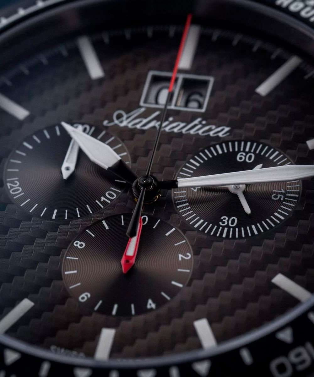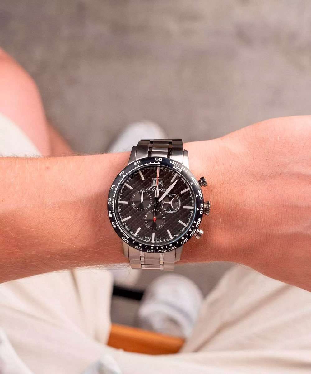Мужские швейцарские часы-хронографХронографФункция позволяет измерять отрезки времени с особой точностью: часы, минуты, секунды. Верным признаком хронографа является наличие на циферблате 3 дополнительных окошек-счётчиков. с секундомеромСекундомерСекундоме́р — прибор, способный измерять интервалы времени с точностью до долей секунды. и  тахиметромТахиметрРазмеченная шкала, располагается на ободке или безеле часов. Тахиметр позволяет рассчитать скорость на определённом участке пути, расстояние измеряется в километрах или милях. Adriatica Aviation A8383.4116CH воплощают в себе элегантность и функциональность, их выбирают целеустремленные мужчины, которые знают цену времени. Темно-серый циферблат часов, защищенный сапфировым стекломСапфировое стеклоПрочный и надёжный материал из кристалла сапфира синтетического происхождения, характеризующийся особой твёрдостью и устойчивостью к царапинам и повреждениям., заключен в корпус из титана диаметром 46 мм и толщиной 12 мм. Надежный кварцевый механизм с калибром Ronda 5040.B обеспечивает высокую точность, а водозащита 5 ATM делает часы устойчивыми к воздействию воды. Стальной браслет с раскладной застёжкойРаскладная застёжкаТакой тип застёжки используется только на браслетах из металла. Она никогда не раскрывается полностью, происходит разделение на 2 и более частей. Раскладывающая застёжка снизит вероятность потери часов к минимуму. обеспечивает комфортное и надежное ношение. Циферблат с метками в виде штрихов имеет 3 дополнительных циферблата, а также окошко даты в положении «12» , что добавляет практичности в повседневной жизни. Люминесцентное покрытиеЛюминесцентное покрытиеПозволяет считывать показания времени в темноте. Производители наносят на стрелки, часовые индексы, безель или поверхность циферблата светонакопительный состав, дающий холодное свечение. на стрелках и метках обеспечивает отличную видимость в темноте.
