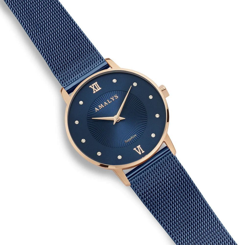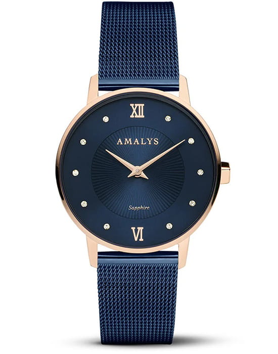 Amalys AMW-181 — женская модель с утончённым классическим дизайном, в которой сочетаются элегантность и практичность. Круглый корпус диаметром 33 мм выполнен из нержавеющей стали с PVD-покрытиемPVDУльтратонкое покрытие наносится в технике вакуумного напыления, сочетает в себе нитрид титана особой прочности со слоем золота или оксида хрома. Несёт в себе декоративную или защитную функцию., гармонирующим с браслетом шириной 16 мм в том же исполнении. Защитную функцию выполняет сапфировое стеклоСапфировое стеклоПрочный и надёжный материал из кристалла сапфира синтетического происхождения, характеризующийся особой твёрдостью и устойчивостью к царапинам и повреждениям., стойкое к царапинам и сохраняющее прозрачность. Механизм — кварцевый, обеспечивающий точность и стабильность хода. Стальной браслет с PVD-покрытиемPVDУльтратонкое покрытие наносится в технике вакуумного напыления, сочетает в себе нитрид титана особой прочности со слоем золота или оксида хрома. Несёт в себе декоративную или защитную функцию. миланского плетения на раскладном замкеРаскладной замокДанный вариант застежки используется только на часах с металлическим браслетом. Отличительная особенность такого крепления в том, что длина браслета становится универсальной и вы можете самостоятельно отрегулировать нужный вам размер – застежка просто двигается по браслету часов. который сочетает надёжность фиксации и удобство повседневного использования. Водозащита 3 ATM защищает часы от случайных брызг и дождя. Циферблат с римскими индексами и изящными стрелками подчёркивает классическую эстетику модели, делая её уместной как в повседневных образах, так и в торжественной обстановке.