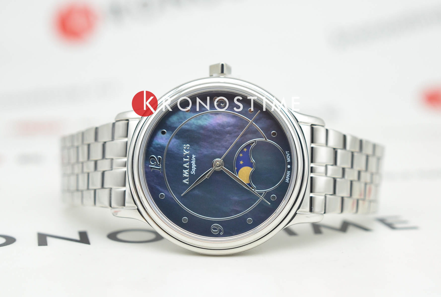 Amalys AMW-203 — женская модель с элегантным классическим стилем и утончёнными деталями. Круглый корпус изготовлен из нержавеющей стали и гармонирует с браслетом в том же исполнении, состоящим из звеньев и обеспечивающим комфортное прилегание к запястью. Защитную функцию выполняет сапфировое стеклоСапфировое стеклоПрочный и надёжный материал из кристалла сапфира синтетического происхождения, характеризующийся особой твёрдостью и устойчивостью к царапинам и повреждениям., которое отличается стойкостью к царапинам и сохраняет высокую прозрачность. В основе лежит кварцевый механизм, гарантирующий точность хода и простоту эксплуатации. Циферблат украшен изящными арабскими цифрами и метками, дополнен утончённым индикатором фаз Луны, который придаёт часам особый шарм и делает их акцентной деталью образа. Водозащита 3 ATM защищает от случайных брызг и дождя. Модель сочетает функциональность и изысканность, подойдёт как для повседневного стиля, так и для особых случаев.