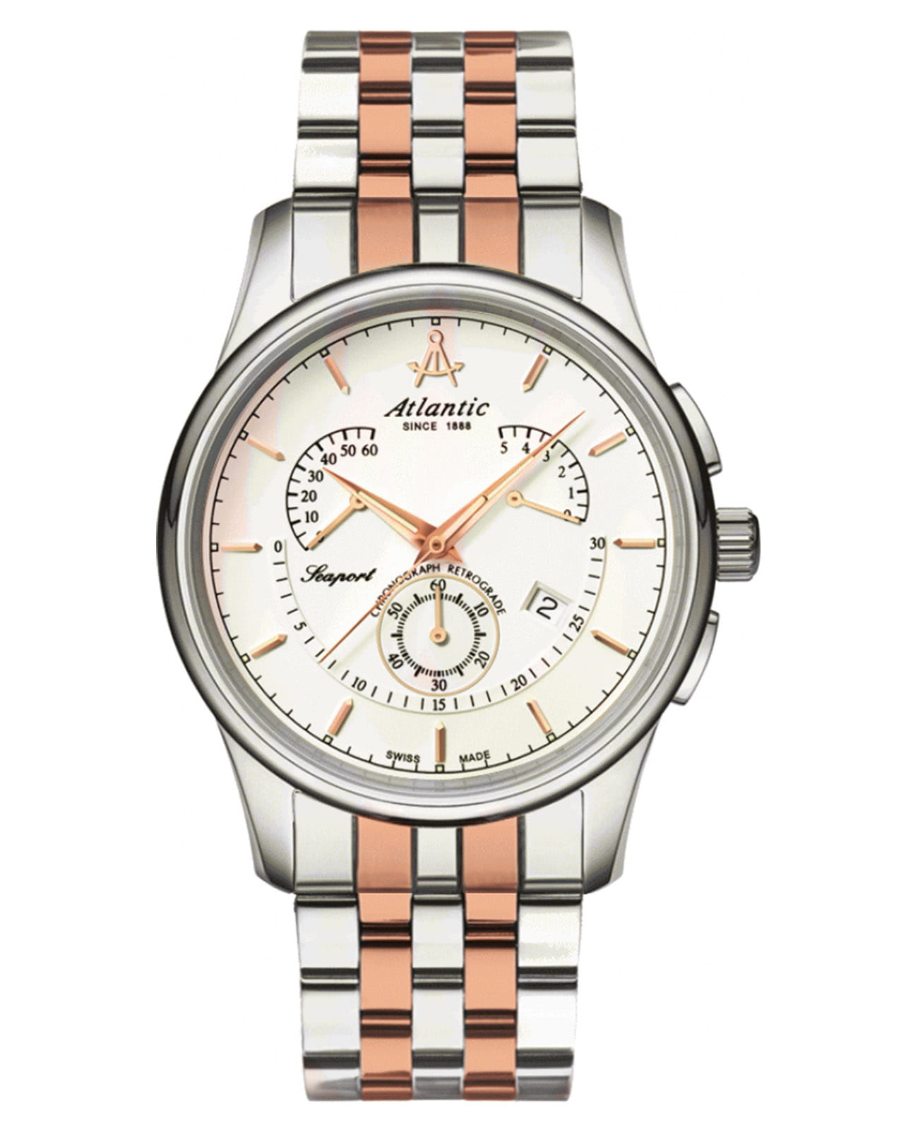 Мужские швейцарские часы-хронографХронографФункция позволяет измерять отрезки времени с особой точностью: часы, минуты, секунды. Верным признаком хронографа является наличие на циферблате 3 дополнительных окошек-счётчиков. Atlantic Seaport 56455.43.21R, кварцевый механизм с высокой точностью. Cапфировое стеклоСапфировое стеклоПрочный и надёжный материал из кристалла сапфира синтетического происхождения, характеризующийся особой твёрдостью и устойчивостью к царапинам и повреждениям. устойчивое к появлению царапин и обладающее высокой прозрачностью. Корпус и браслет часов изготовлены из нержавеющей стали. На циферблате расположены три дополнительных индикатора, окошко даты находится в положении 4 часов. Стрелки с люминесцентным покрытиемЛюминесцентное покрытиеПозволяет считывать показания времени в темноте. Производители наносят на стрелки, часовые индексы, безель или поверхность циферблата светонакопительный состав, дающий холодное свечение.. Класс водозащиты: 50 метров, позволит защитить корпус от случайных брызг или капель дождя. Стальной браслет с частичным PVDPVDУльтратонкое покрытие наносится в технике вакуумного напыления, сочетает в себе нитрид титана особой прочности со слоем золота или оксида хрома. Несёт в себе декоративную или защитную функцию. покрытием на раскладной застёжкеРаскладная застёжкаТакой тип застёжки используется только на браслетах из металла. Она никогда не раскрывается полностью, происходит разделение на 2 и более частей. Раскладывающая застёжка снизит вероятность потери часов к минимуму..