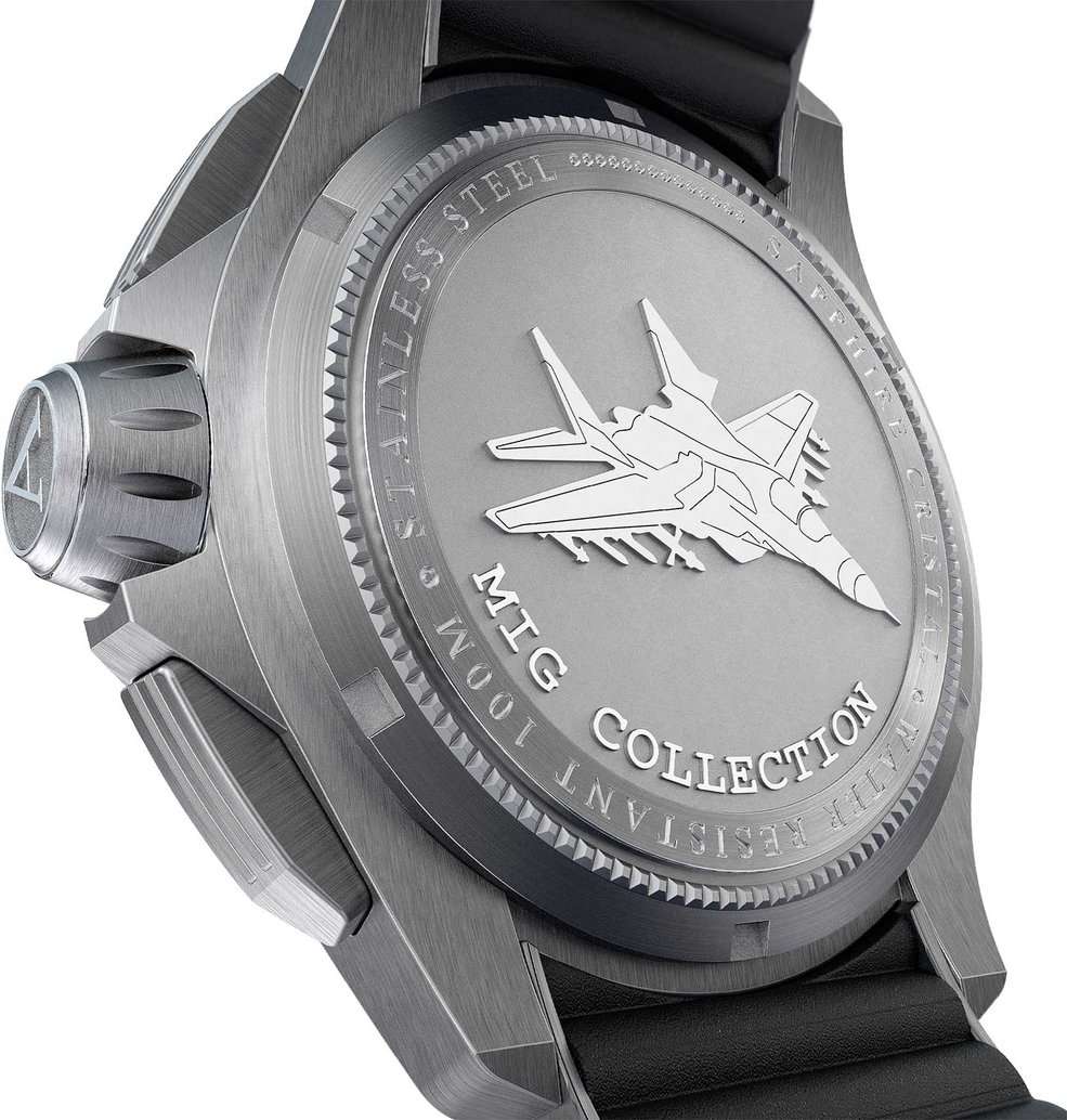 Aviator M.2.19.0.135.6 “MiG‑35” — выразительный швейцарский хронограф, вдохновлённый аэродинамикой и духом истребителя MiG‑35. Корпус диаметром 45 мм из нержавеющей стали подчёркивает мощь и надёжность, дополнен герметичной конструкцией до 100 м и завинчивающейся заводной головкой.