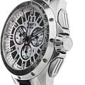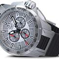 Циферблат сложной структуры — в серебристо‑сером тоне с трёхзонным дизайн‑решением: крупная индикация даты, три субциферблата хронографа и широкие стрелки с люминесцентным покрытиемЛюминесцентное покрытиеПозволяет считывать показания времени в темноте. Производители наносят на стрелки, часовые индексы, безель или поверхность циферблата светонакопительный состав, дающий холодное свечение. обеспечивают мгновенное считывание информации. Обод корпуса украшен гравировкой «tachymetre», подчёркивающей спортивную тематику.
