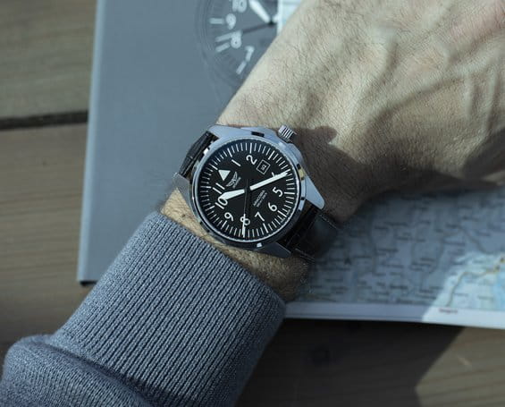 Циферблат в стиле Type A имеет крупные арабские цифры и жёсткий контраст, соответствующий классическим пилотским образцам. Обе стрелки и метки покрыты люминесцентным покрытиемЛюминесцентное покрытиеПозволяет считывать показания времени в темноте. Производители наносят на стрелки, часовые индексы, безель или поверхность циферблата светонакопительный состав, дающий холодное свечение. — это обеспечивает отличную читаемость в любых условиях. Окошко даты расположено у отметки «3 часа».