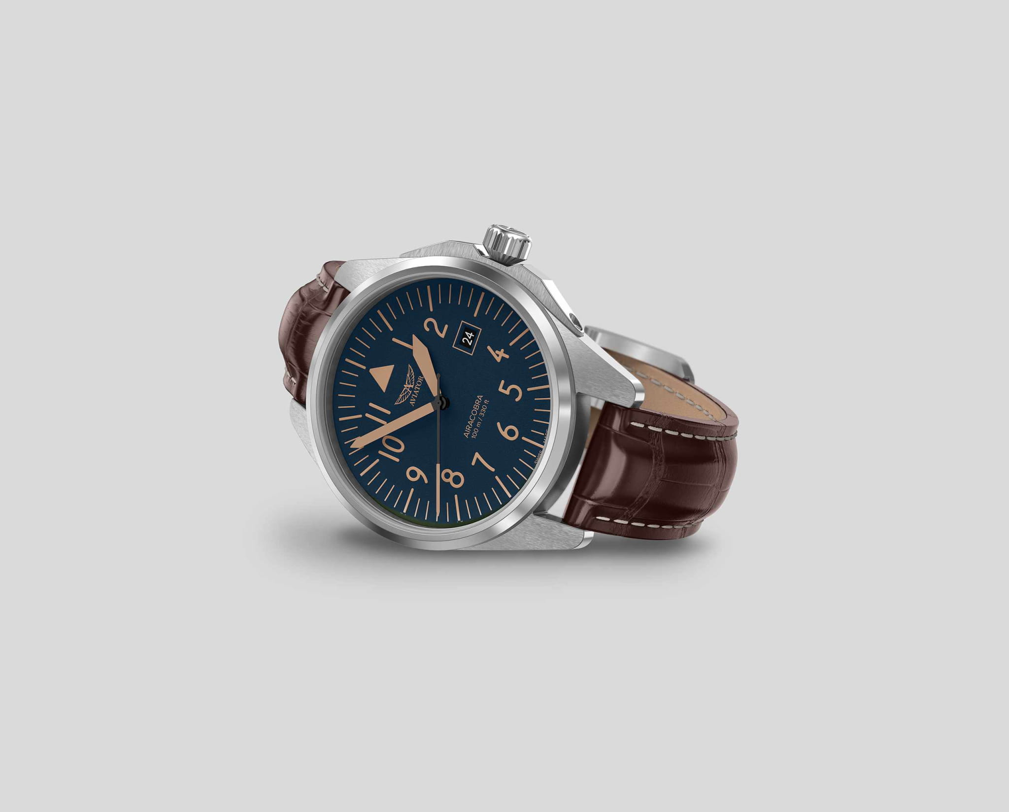 Aviator V.1.38.0.318.4 “Airacobra 43 Type A” — надёжные швейцарские пилотские часы с насыщенным функционалом и строгим авиационным дизайном. Корпус диаметром 42,8 мм выполнен из нержавеющей стали.