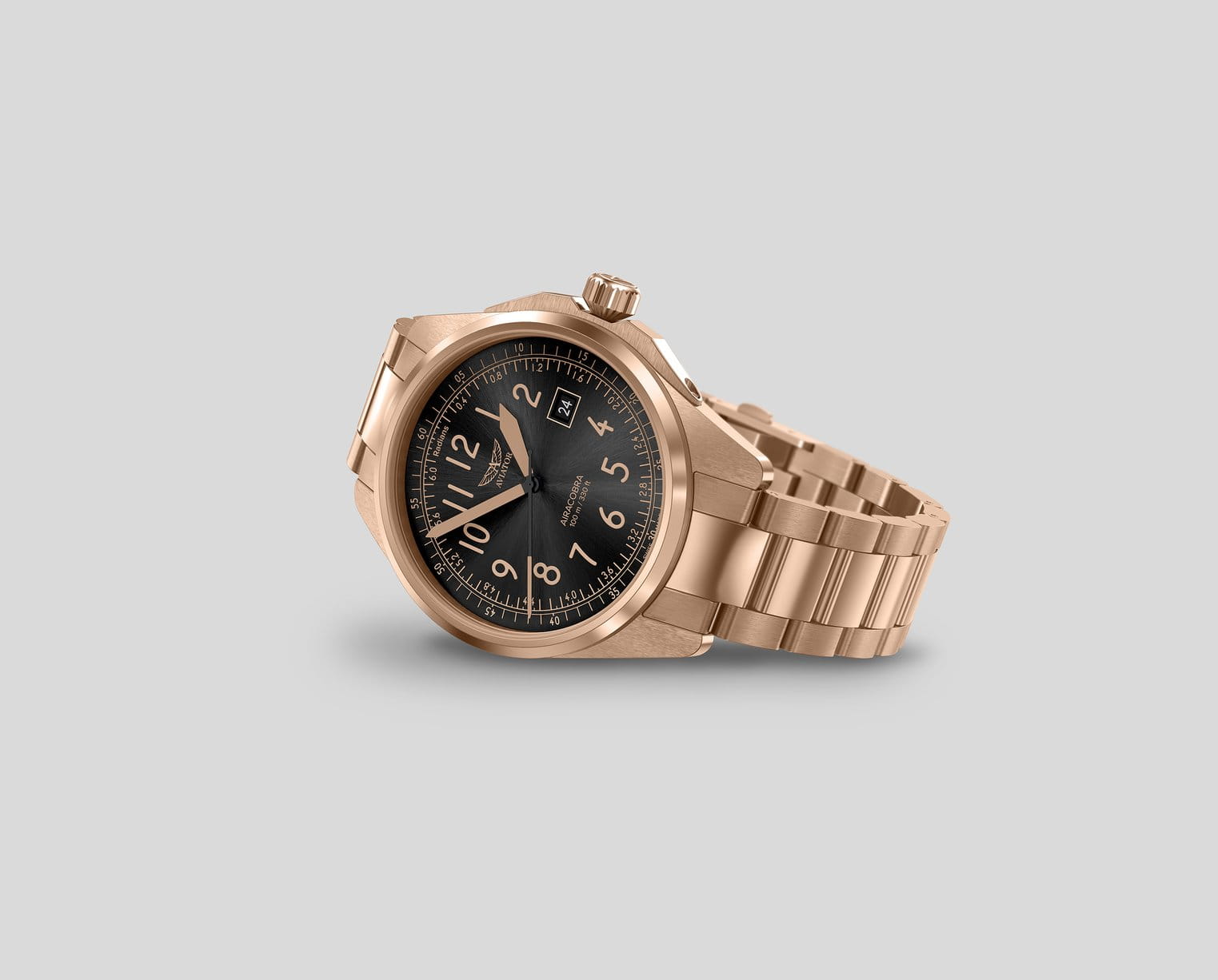 Aviator V.1.38.2.323.5 “Airacobra 43 Type A” — надёжные швейцарские пилотские часы с насыщенным функционалом и строгим авиационным дизайном. Корпус диаметром 42,8 мм выполнен из нержавеющей стали с PVD-покрытиемPVDУльтратонкое покрытие наносится в технике вакуумного напыления, сочетает в себе нитрид титана особой прочности со слоем золота или оксида хрома. Несёт в себе декоративную или защитную функцию..