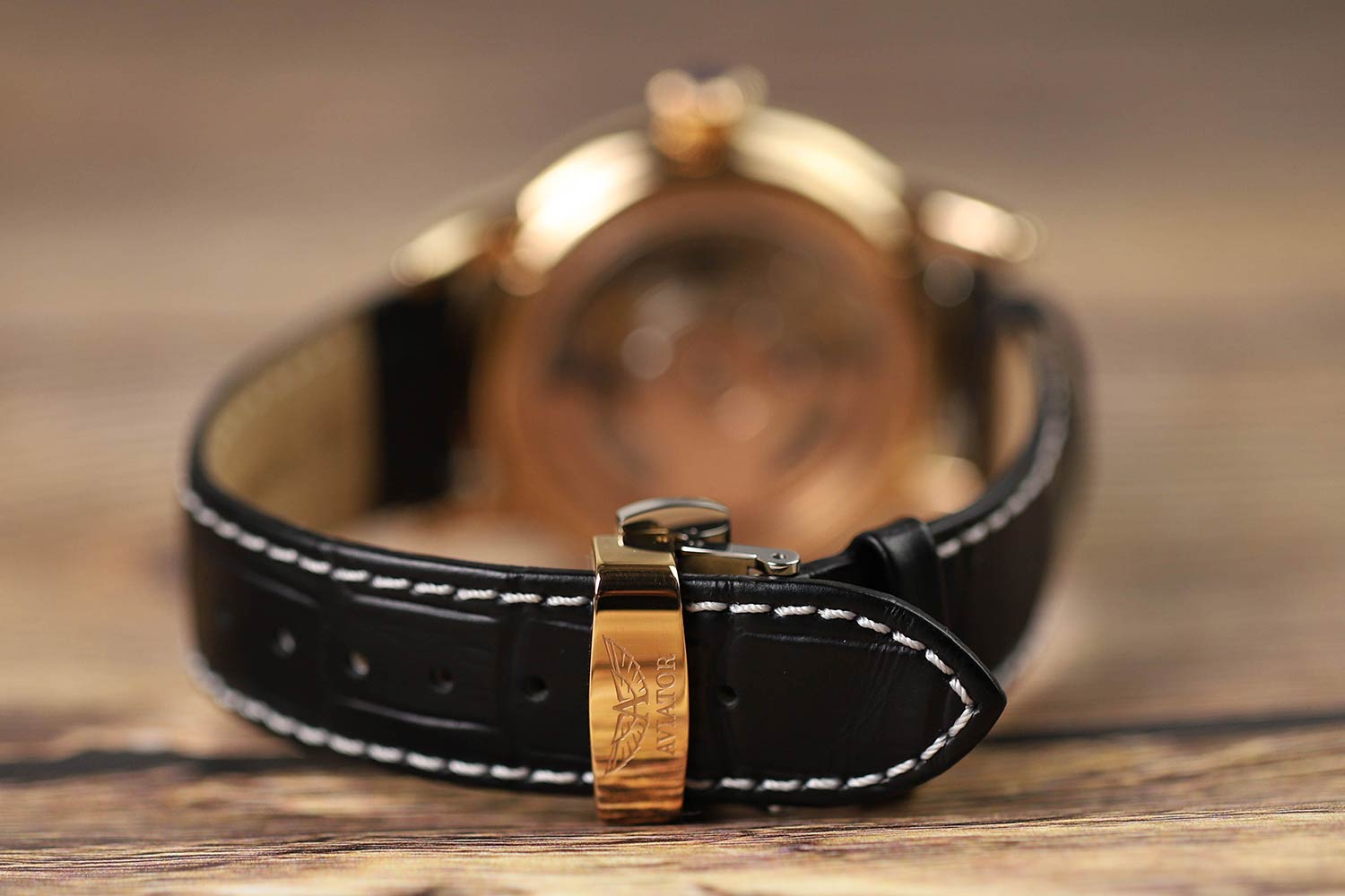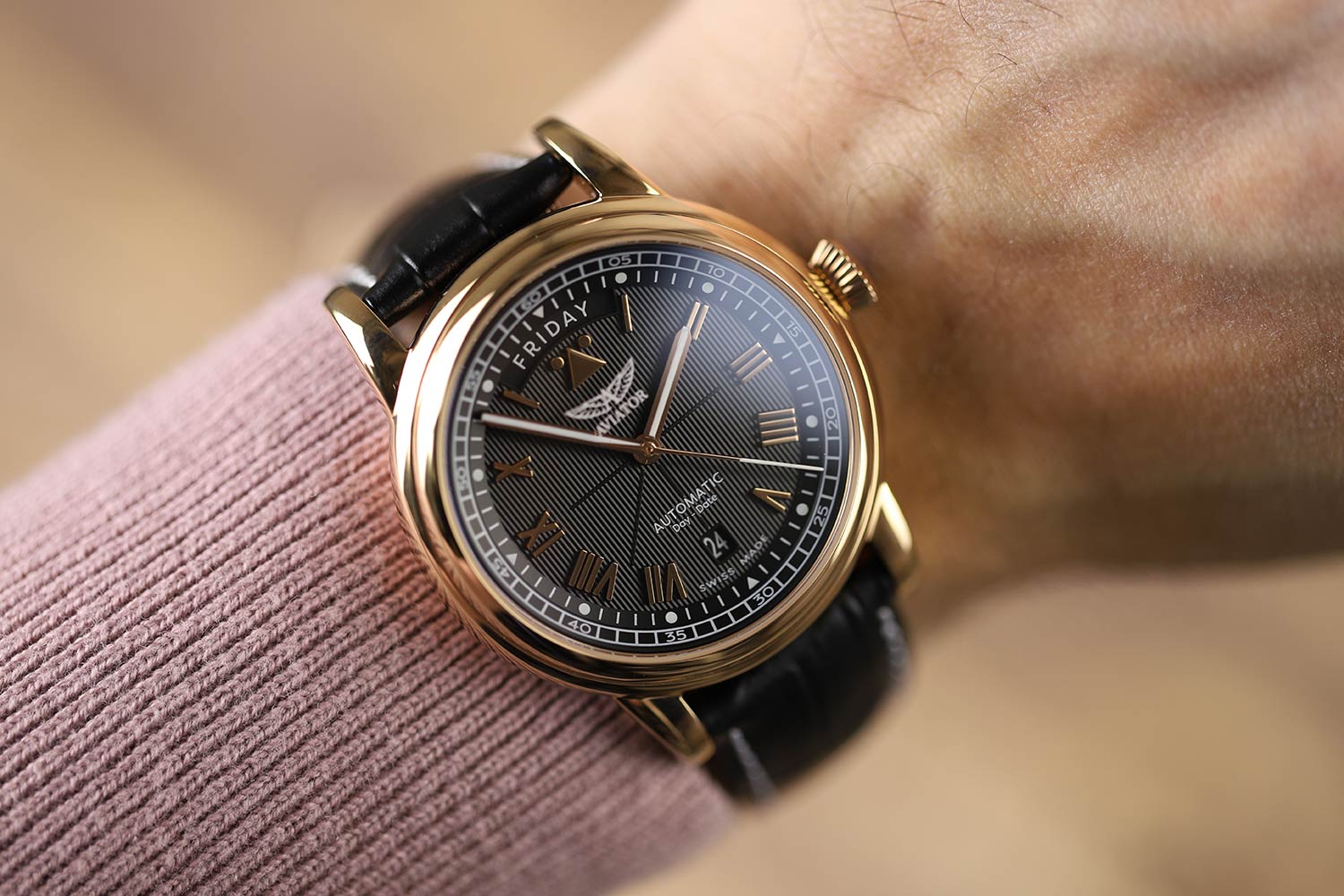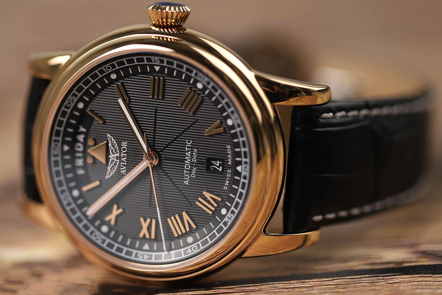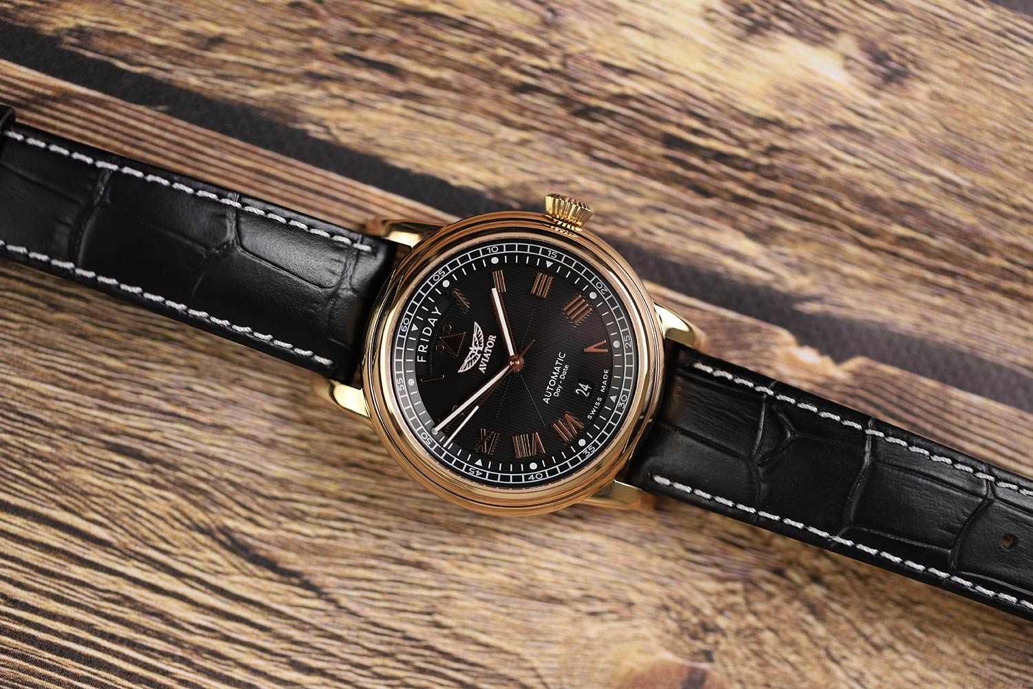 Aviator Douglas Day Date V.3.35.2.275.4 — швейцарские часы в классике авиадизайна, сочетающие безупречную читаемость и высокую надёжность. Лимитированная серия – 950 экземпляров. Корпус диаметром 41,2 мм выполнен из нержавеющей стали 316L с PVD-покрытиемPVDУльтратонкое покрытие наносится в технике вакуумного напыления, сочетает в себе нитрид титана особой прочности со слоем золота или оксида хрома. Несёт в себе декоративную или защитную функцию. цвета розового золота. Накладные метки выполнены в виде римских цифр. Окошко даты находится в положении 6 часов. День недели находится в положении 12 часов. Часовые метки и стрелки покрыты люминесцентным покрытиемЛюминесцентное покрытиеПозволяет считывать показания времени в темноте. Производители наносят на стрелки, часовые индексы, безель или поверхность циферблата светонакопительный состав, дающий холодное свечение. Superluminova, позволяющим легко определять время даже в тёмное время суток. Поверхность защищена прочным сапфировым стекломСапфировое стеклоПрочный и надёжный материал из кристалла сапфира синтетического происхождения, характеризующийся особой твёрдостью и устойчивостью к царапинам и повреждениям. с антибликовым покрытием, устойчивым к царапинам. Сердце модели — швейцарский механизм Sellita SW 240-1, известный своей точностью и долговечностью. Водозащита 100 метров, позволит плавать, нырять и заниматься другими водными видами спорта. Завинчивающаяся головка и задняя крышка обеспечивают уверенную ударопрочностьУдаропрочный корпусМеханизм заключён в корпус, выполненный из современных материалов, устойчивых к ударам, механическим повреждениям и падению с высоты: инновационный пластик, карбон, нержавеющая сталь, титан. и надёжную защиту от влаги и пыли. В механизме 26 камней, запас хода до 41 час. Модель дополнена кожаным ремешком с выразительной текстурой и классическим стилем, закреплённым с помощью застёжке-бабочке с кнопкамиЗастёжка "бабочка"Такой вид застёжки дополняется предохранителями, помогающими избежать случайного раскрытия браслета. Обладают изящным исполнением. — для максимального комфорта и лёгкости в повседневном использовании. Модель вдохновлена американским пассажирским самолетом Douglas DC-3, который является одним из лучших самолетов за всю историю авиации. Aviator — это образец лётной точности, инженерной чёткости и сдержанной роскоши, идеально подходящий для тех, кто ценит функциональность и уверенность в каждом элементе.