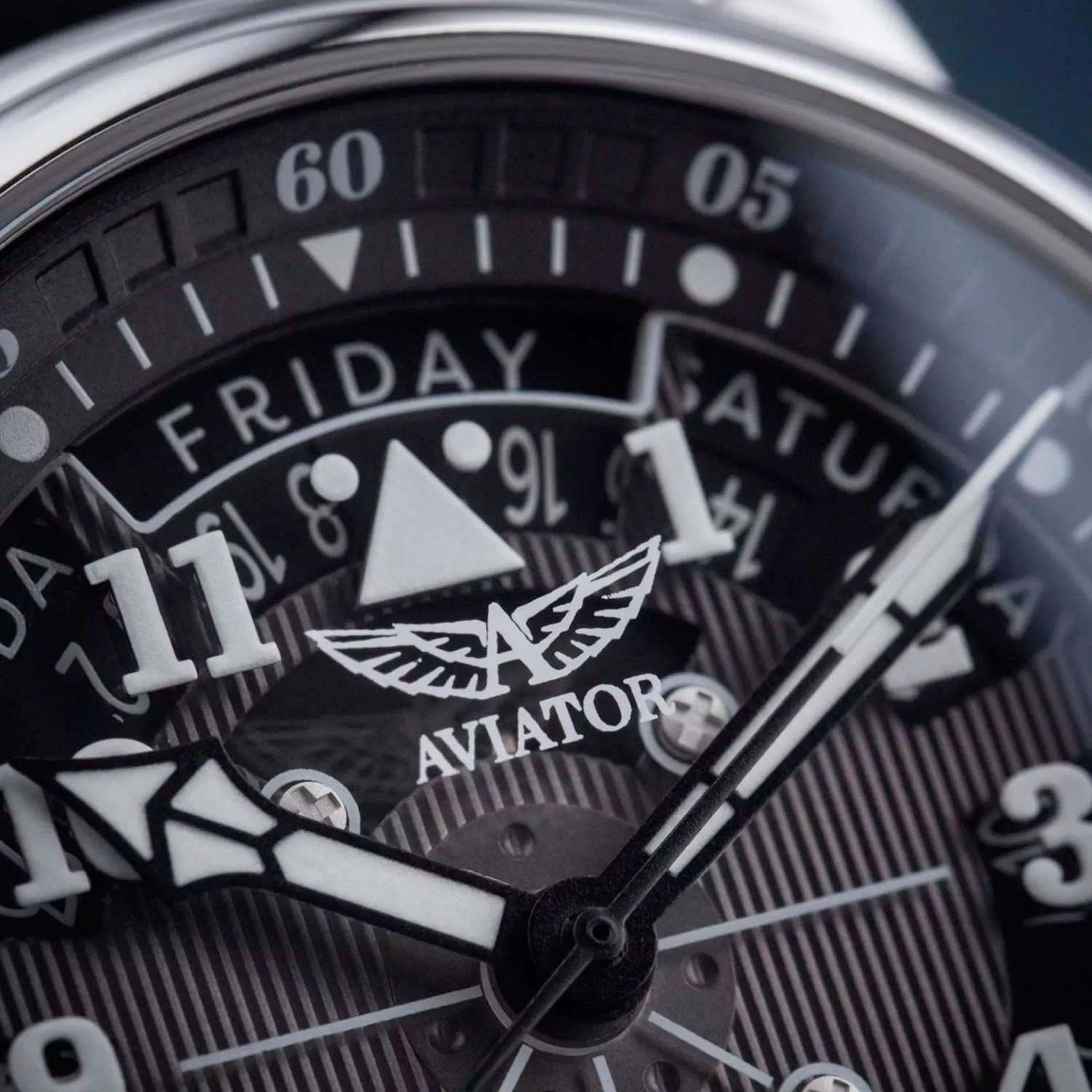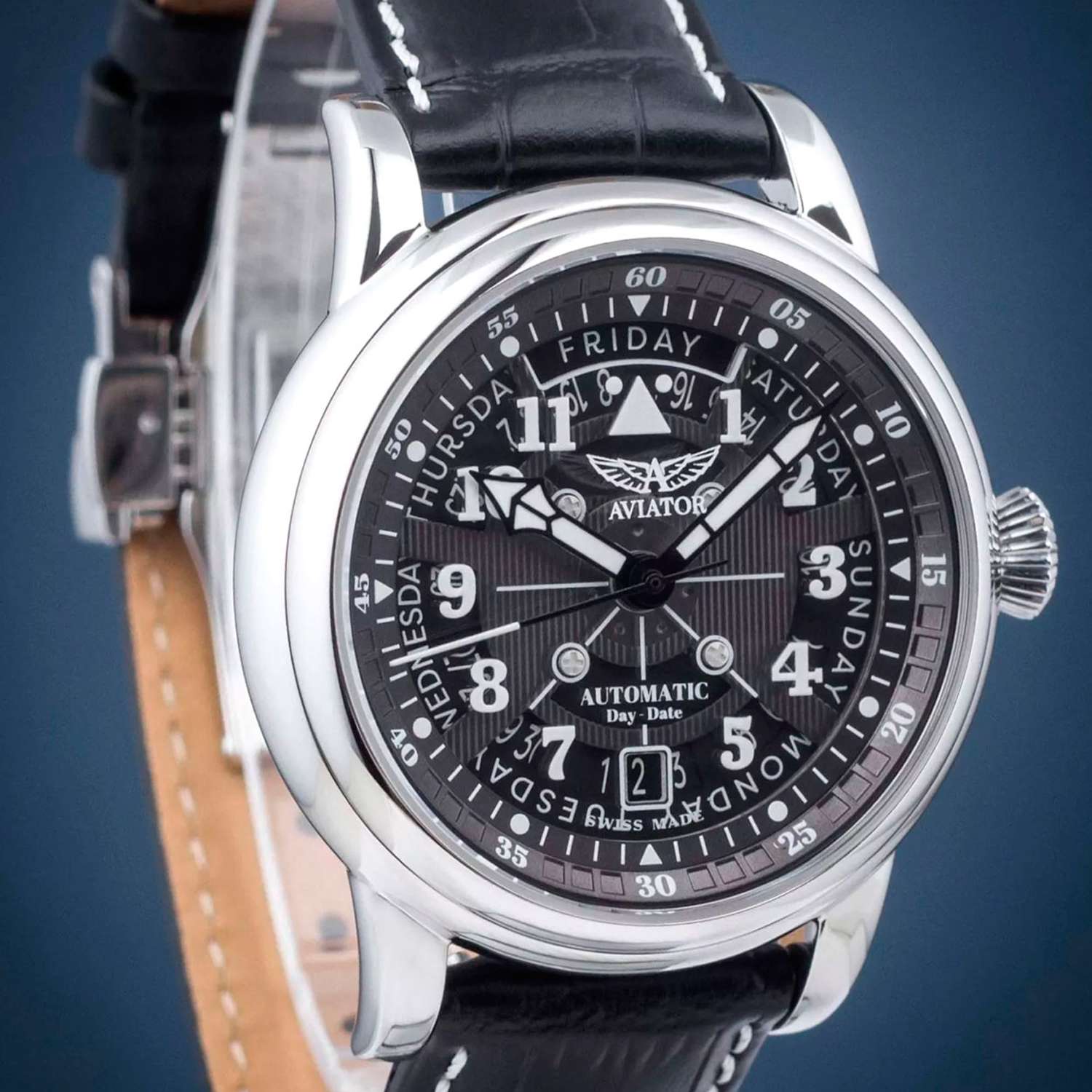 Aviator Douglas Day Date V.3.36.0.284.4— швейцарские часы в классике авиадизайна, сочетающие безупречную читаемость и высокую надёжность. Лимитированная серия. Корпус диаметром 41 мм выполнен из нержавеющей стали 316L. Накладные метки выполнены в виде арабских цифр. Окошко даты находится в положении 6 часов. День недели находится в положении 12 часов. Часовые метки и стрелки покрыты люминесцентным покрытиемЛюминесцентное покрытиеПозволяет считывать показания времени в темноте. Производители наносят на стрелки, часовые индексы, безель или поверхность циферблата светонакопительный состав, дающий холодное свечение. Superluminova, позволяющим легко определять время даже в тёмное время суток. Поверхность защищена прочным сапфировым стекломСапфировое стеклоПрочный и надёжный материал из кристалла сапфира синтетического происхождения, характеризующийся особой твёрдостью и устойчивостью к царапинам и повреждениям. с антибликовым покрытием, устойчивым к царапинам. Сердце модели — швейцарский механизм Sellita SW 240-2, известный своей точностью и долговечностью. Водозащита 100 метров, позволит плавать, нырять и заниматься другими водными видами спорта. Завинчивающаяся головка и задняя крышка обеспечивают уверенную ударопрочностьУдаропрочный корпусМеханизм заключён в корпус, выполненный из современных материалов, устойчивых к ударам, механическим повреждениям и падению с высоты: инновационный пластик, карбон, нержавеющая сталь, титан. и надёжную защиту от влаги и пыли. В механизме 26 камней, запас хода до 41 час. Модель дополнена кожаным ремешком с выразительной текстурой и классическим стилем, закреплённым с помощью застёжке-бабочке с кнопкамиЗастёжка "бабочка"Такой вид застёжки дополняется предохранителями, помогающими избежать случайного раскрытия браслета. Обладают изящным исполнением. — для максимального комфорта и лёгкости в повседневном использовании. Ротор механизма с заклепанными элементами и вырезанными окнами напоминает фюзеляж самолета. Aviator — это образец лётной точности, инженерной чёткости и сдержанной роскоши, идеально подходящий для тех, кто ценит функциональность и уверенность в каждом элементе.