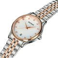 Женские часы Balmain Beleganza B8358.33.86 кварцевый механизм с высокой точностью. Сапфировое стеклоСапфировое стеклоПрочный и надёжный материал из кристалла сапфира синтетического происхождения, характеризующийся особой твёрдостью и устойчивостью к царапинам и повреждениям. устойчивое к появлению царапин, обладающее высокой прозрачностью. Корпус изготовлен из нержавеющей стали. Класс водозащиты: 50 метров, позволит защитить корпус от случайных брызг или капель дождя. Стальной браслет с частичным PVD-покрытиемPVDУльтратонкое покрытие наносится в технике вакуумного напыления, сочетает в себе нитрид титана особой прочности со слоем золота или оксида хрома. Несёт в себе декоративную или защитную функцию.. на застёжке «бабочка» с кнопкамиЗастёжка "бабочка"Такой вид застёжки дополняется предохранителями, помогающими избежать случайного раскрытия браслета. Обладают изящным исполнением. .. БезельБезельВнешний ободок, закрепляющий стекло. В спортивных часах так называется поворотное кольцо с делениями на циферблате, выполняет роль таймера – замеряет отрезки времени на шкале. Неподвижный безель – элемент декора. Однонаправленно вращающийся безель на дайверских часах позволяет фиксировать моменты погружения и выныривания на поверхность. с PVD-покрытиемPVDУльтратонкое покрытие наносится в технике вакуумного напыления, сочетает в себе нитрид титана особой прочности со слоем золота или оксида хрома. Несёт в себе декоративную или защитную функцию.. Окошко даты находится в положении 6 часов.