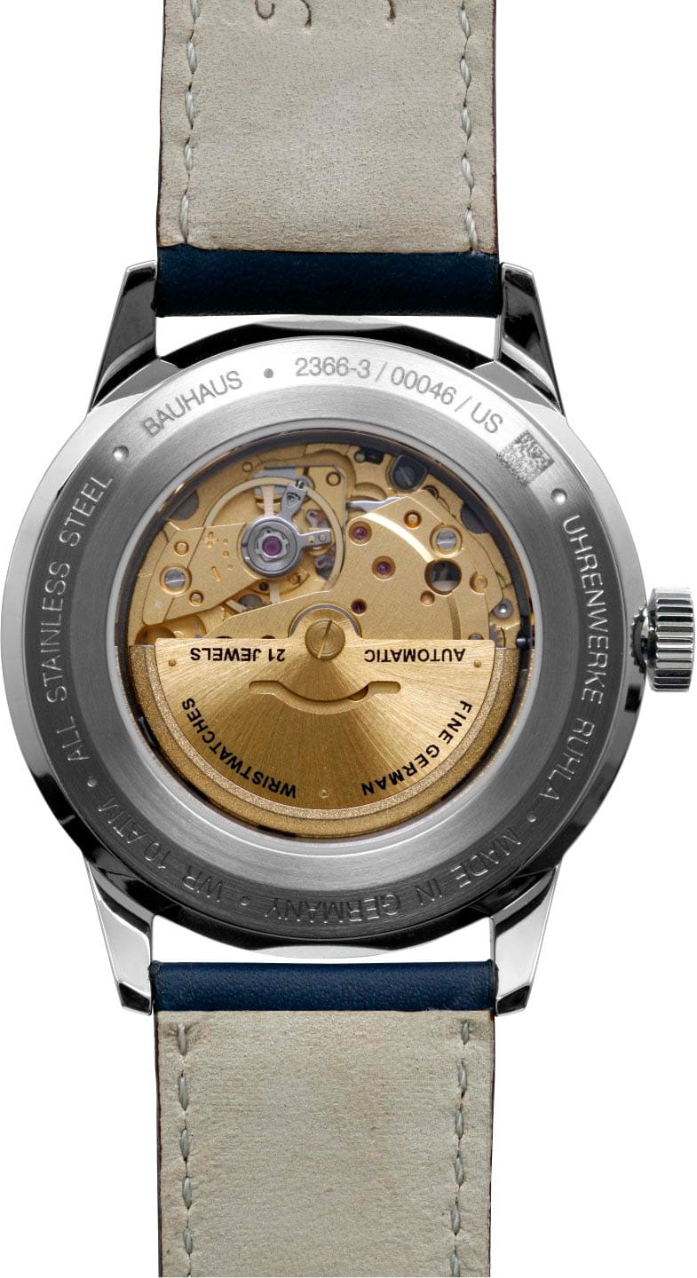 Мужские механические часы с автоподзаводом Bauhaus — это аксессуар в стиле авиационных хронометров. Корпус диаметром 42 мм и толщиной 14 мм выполнен из стали с комбинированной отделкой: матовой и полированной. Циферблат синего цвета выполнен по технологии Sunray («солнечные лучи») и оформлен штрихами и стрелками. Метки и стрелки с люминесцентным покрытиемЛюминесцентное покрытиеПозволяет считывать показания времени в темноте. Производители наносят на стрелки, часовые индексы, безель или поверхность циферблата светонакопительный состав, дающий холодное свечение., обеспечивающим хорошую читаемость в темноте. Окошко даты и дня недели расположено в положении 3 часов. На циферблате присутствует шкала пульсометра, рассчитанная на 30 ударов. Циферблат защищён прочным минеральным стекломМинеральное стеклоМинеральное стекло представляет собой искусственно выращенный минерал кварца. Такое стекло отличается особой устойчивостью к повреждениям и царапинам. Уступает по некоторым качествам сапфировому стеклу. K1. Механизм — автоматический калибр Miyota 8205 (21 камень, частота 21 600 полуколебаний в час) с запасом хода до 42 часов. Рифлёная заводная головка украшена фирменным логотипом. Прозрачная задняя крышка позволяет наблюдать за работой механизма. Часы оснащены кожаным ремешком с декоративной белой строчкой и классической пряжкой. Водонепроницаемость 100 м позволяет использовать часы для плавания и повседневного ношения. Идеальный выбор для тех, кто ценит немецкое качество и функциональный дизайн.