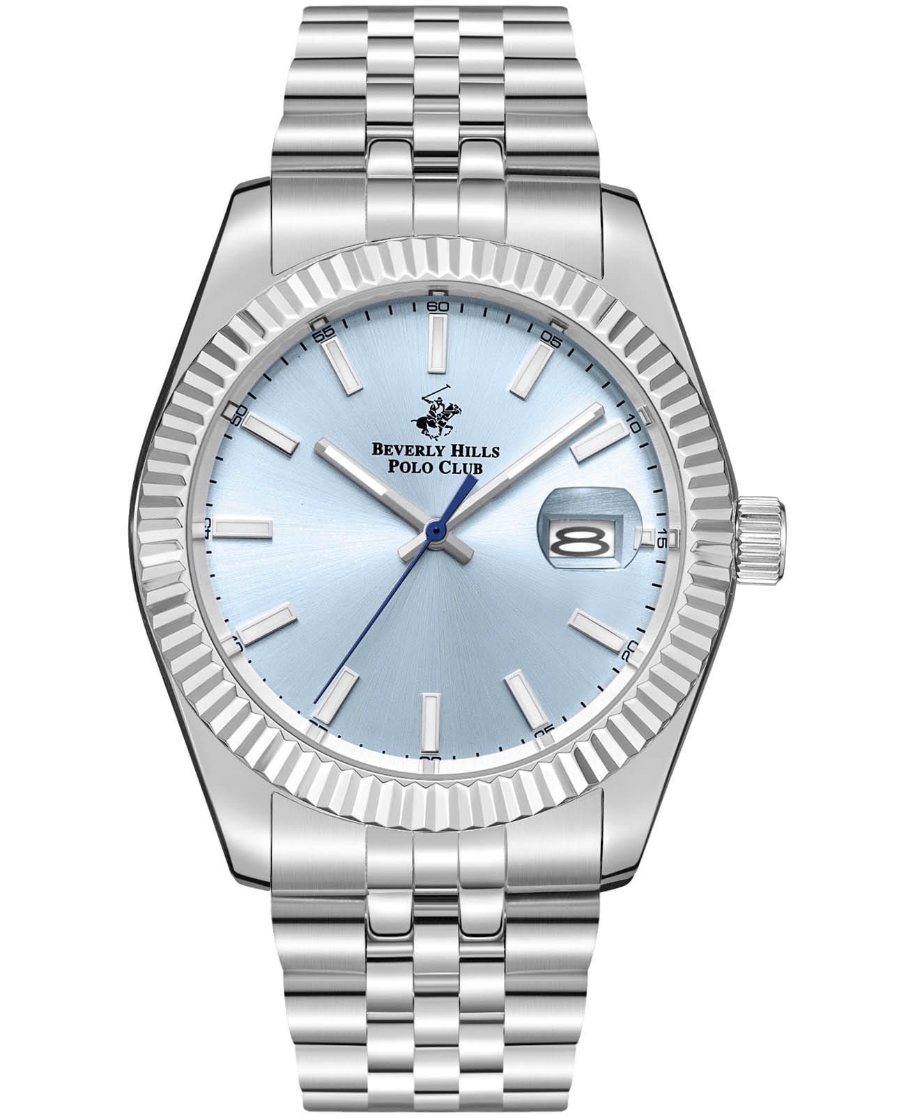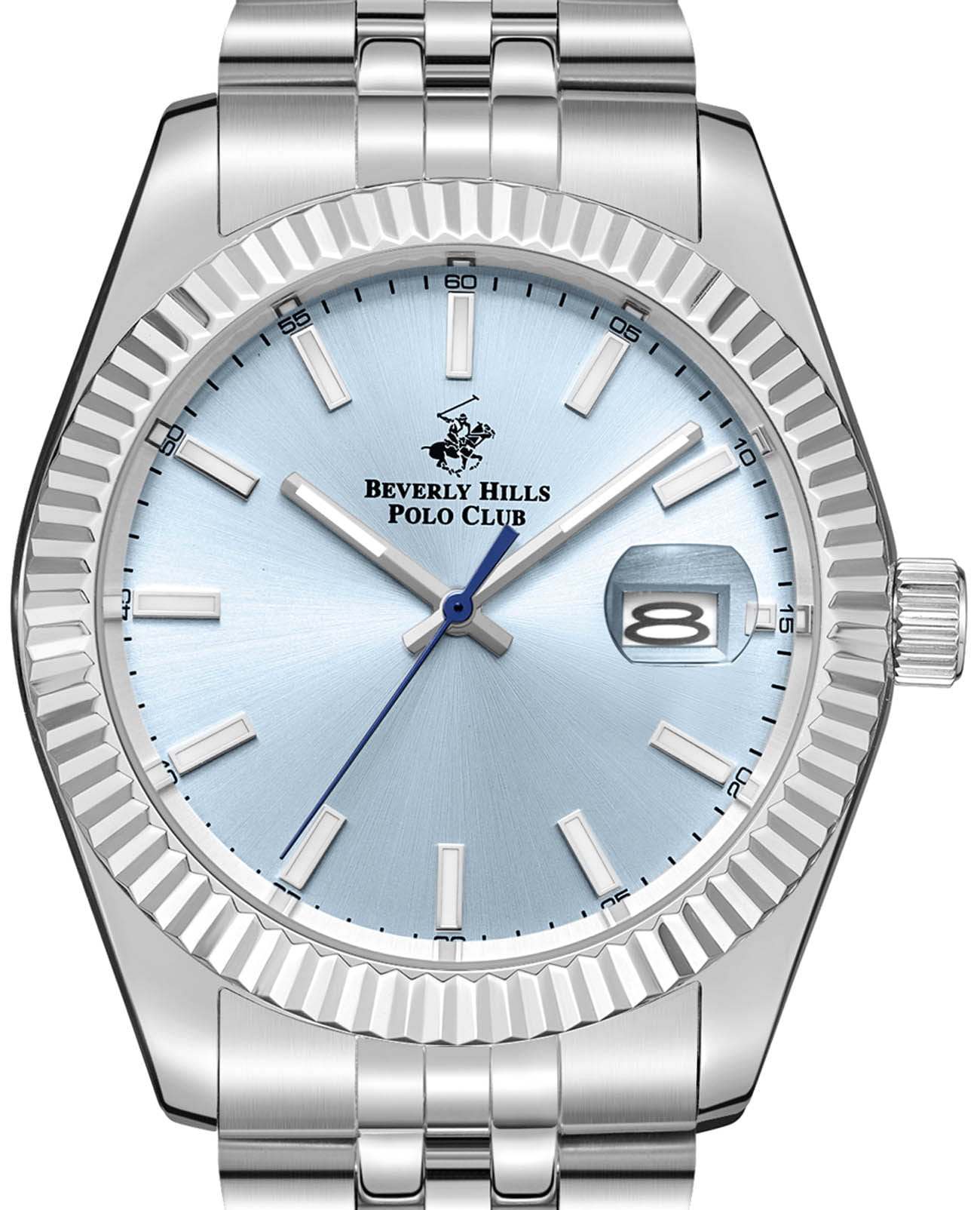 BEVERLY HILLS POLO CLUB BP3018X.302 — стильные мужские часы, сочетающие спортивную динамику и функциональность. Крупный корпус выполнен из нержавеющей стали серебристого цвета, диаметром 41 мм, гармонично дополнен стальным браслетом на застёжке-бабочке с кнопкамиЗастёжка "бабочка"Такой вид застёжки дополняется предохранителями, помогающими избежать случайного раскрытия браслета. Обладают изящным исполнением. . Рифленый неподвижный безельБезельВнешний ободок, закрепляющий стекло. В спортивных часах так называется поворотное кольцо с делениями на циферблате, выполняет роль таймера – замеряет отрезки времени на шкале. Неподвижный безель – элемент декора. Однонаправленно вращающийся безель на дайверских часах позволяет фиксировать моменты погружения и выныривания на поверхность.. Циферблат с акцентными метками и стрелками с люминесцентным покрытиемЛюминесцентное покрытиеПозволяет считывать показания времени в темноте. Производители наносят на стрелки, часовые индексы, безель или поверхность циферблата светонакопительный состав, дающий холодное свечение. делает модель более практичной. Минеральное стеклоМинеральное стеклоМинеральное стекло представляет собой искусственно выращенный минерал кварца. Такое стекло отличается особой устойчивостью к повреждениям и царапинам. Уступает по некоторым качествам сапфировому стеклу. с сапфировым покрытием защищает циферблат от царапин, а кварцевый механизм обеспечивает высокую точность. Окошко даты находится в положении 3 часа. Благодаря своей универсальной эстетике эти часы уместны и в деловой среде, и в повседневном образе. Идеальный выбор для тех, кто ценит элегантный дизайн и качество. Водозащита до 50 метров позволит защитить корпус от случайных брызг или капель дождя.