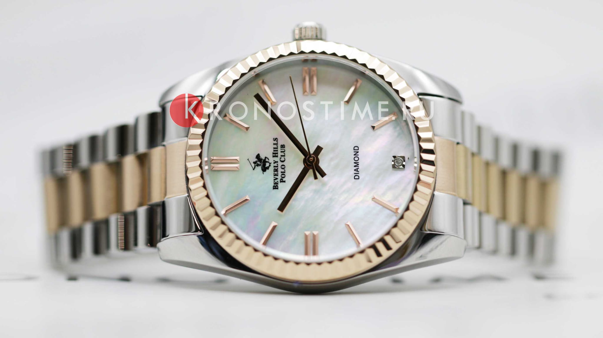 Женские часы Beverly Hills Polo BP3172C.520 с надёжным кварцевым механизмом. Минеральное стеклоМинеральное стеклоМинеральное стекло представляет собой искусственно выращенный минерал кварца. Такое стекло отличается особой устойчивостью к повреждениям и царапинам. Уступает по некоторым качествам сапфировому стеклу. устойчивое к появлению царапин, обладающее высокой прозрачностью. Класс водозащиты: 30 метров, позволит защитить корпус от случайных брызг или капель дождя. Корпус часов изготовлен из стали. Стальной браслет с частичным IP-покрытиемIP-покрытиеМетод ионного напыления. Демонстрирует повышенную устойчивость к истиранию, окислению и химическим веществам. Под воздействием высокого давления и температуры около 1500°C молекулы металла надёжно соединяются с частицами корпуса часов. на раскладной застёжкеРаскладная застёжкаТакой тип застёжки используется только на браслетах из металла. Она никогда не раскрывается полностью, происходит разделение на 2 и более частей. Раскладывающая застёжка снизит вероятность потери часов к минимуму.. БезельБезельВнешний ободок, закрепляющий стекло. В спортивных часах так называется поворотное кольцо с делениями на циферблате, выполняет роль таймера – замеряет отрезки времени на шкале. Неподвижный безель – элемент декора. Однонаправленно вращающийся безель на дайверских часах позволяет фиксировать моменты погружения и выныривания на поверхность. с IP-покрытиемIP-покрытиеМетод ионного напыления. Демонстрирует повышенную устойчивость к истиранию, окислению и химическим веществам. Под воздействием высокого давления и температуры около 1500°C молекулы металла надёжно соединяются с частицами корпуса часов.. Циферблат инкрустирован бриллиантом.