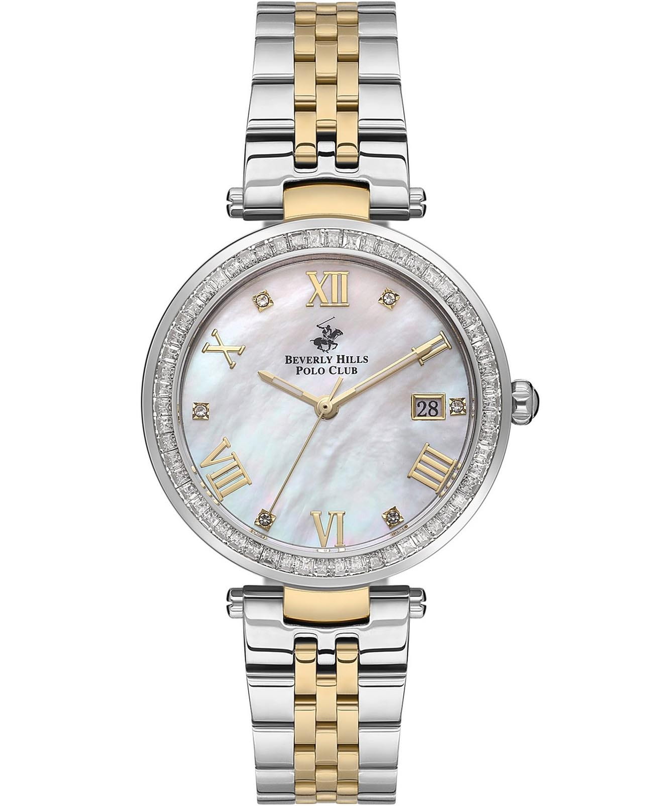 Часы Beverly Hills Polo Club BP3583X.220 — элегантная женская модель, сочетающая классический дизайн и современные технологии. Корпус диаметром 34 мм выполнен из нержавеющей стали с PVD-покрытиемPVDУльтратонкое покрытие наносится в технике вакуумного напыления, сочетает в себе нитрид титана особой прочности со слоем золота или оксида хрома. Несёт в себе декоративную или защитную функцию. золотого цвета. Перламутровый циферблат украшен римскими цифрами и кристаллами, придающими часам изысканный вид, и защищён минеральным стекломМинеральное стеклоМинеральное стекло представляет собой искусственно выращенный минерал кварца. Такое стекло отличается особой устойчивостью к повреждениям и царапинам. Уступает по некоторым качествам сапфировому стеклу., устойчивым к царапинам.