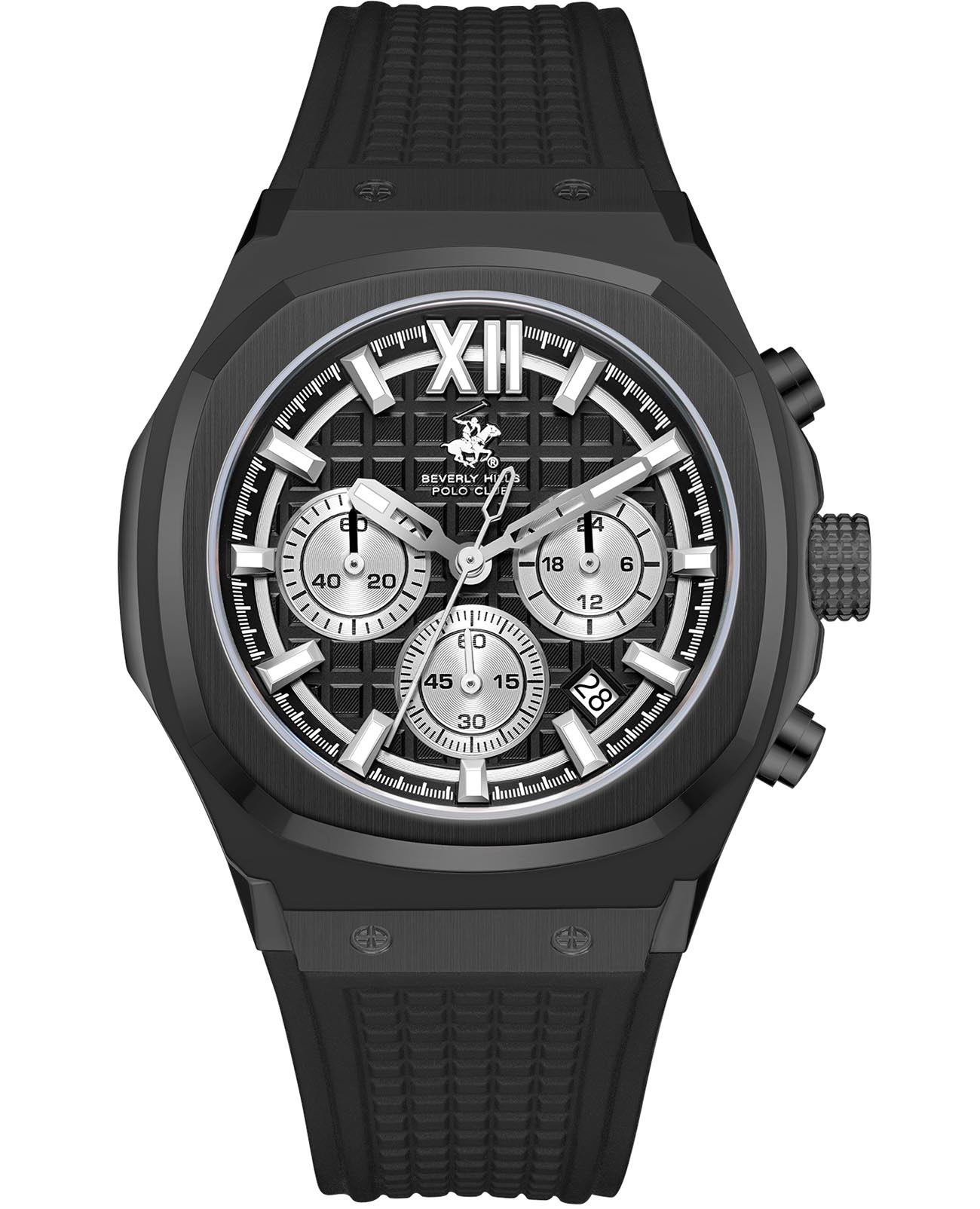 Американские мужские часы Beverly Hills Polo Club BP3785X.651 - это стильный мужской хронографХронографФункция позволяет измерять отрезки времени с особой точностью: часы, минуты, секунды. Верным признаком хронографа является наличие на циферблате 3 дополнительных окошек-счётчиков., который сочетает элегантный дизайн и практичность. Корпус выполнен из нержавеющей стали с IP-покрытиемIP-покрытиеМетод ионного напыления. Демонстрирует повышенную устойчивость к истиранию, окислению и химическим веществам. Под воздействием высокого давления и температуры около 1500°C молекулы металла надёжно соединяются с частицами корпуса часов. черного цвета, диаметром 45,5 мм. Надежное минеральное стеклоМинеральное стеклоМинеральное стекло представляет собой искусственно выращенный минерал кварца. Такое стекло отличается особой устойчивостью к повреждениям и царапинам. Уступает по некоторым качествам сапфировому стеклу. с сапфировым покрытием защищает циферблат от царапин и обеспечивает долговечность. Модель оснащена кварцевым механизмом, обеспечивающим высокую точность хода. Каучуковый ремешок на стандартной застежке обеспечивает комфортное ношение. Функциональность модели расширена за счёт индикации даты и дополнительным 24-х часовым индикатором. Стрелки и метки с люминесцентным покрытиемЛюминесцентное покрытиеПозволяет считывать показания времени в темноте. Производители наносят на стрелки, часовые индексы, безель или поверхность циферблата светонакопительный состав, дающий холодное свечение. позволяют легко считывать время даже в условиях недостаточного освещения. Водозащита 50 метров позволит защитить корпус от случайных брызг или капель дождя. Эта модель – отличный выбор для тех, кто ищет сочетание стиля, качества и функциональности. Часы станут не только полезным аксессуаром, но и выразительным элементом вашего имиджа.