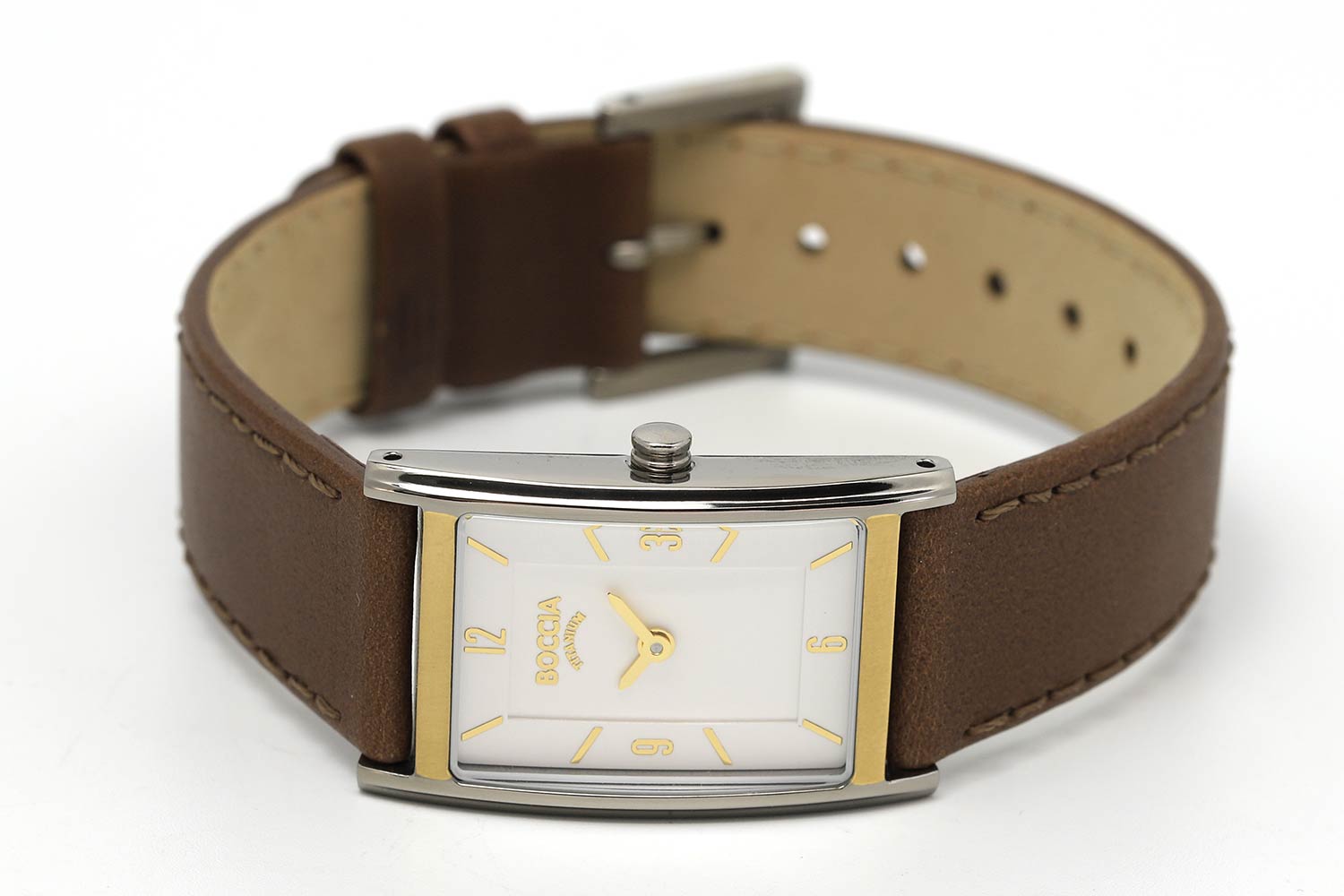 Женские наручные часы Boccia Titanium 3212-06 с надёжным кварцевым механизмом. Корпус часов изготовлен из титана с частичным PVD-покрытиемPVDУльтратонкое покрытие наносится в технике вакуумного напыления, сочетает в себе нитрид титана особой прочности со слоем золота или оксида хрома. Несёт в себе декоративную или защитную функцию.. Минеральное стеклоМинеральное стеклоМинеральное стекло представляет собой искусственно выращенный минерал кварца. Такое стекло отличается особой устойчивостью к повреждениям и царапинам. Уступает по некоторым качествам сапфировому стеклу. устойчивое к мелким механическим повреждениям. Кожаный ремешок на стандартной застёжке. Класс водозащиты: 50 метров, позволит защитить корпус от случайных брызг или капель дождя.