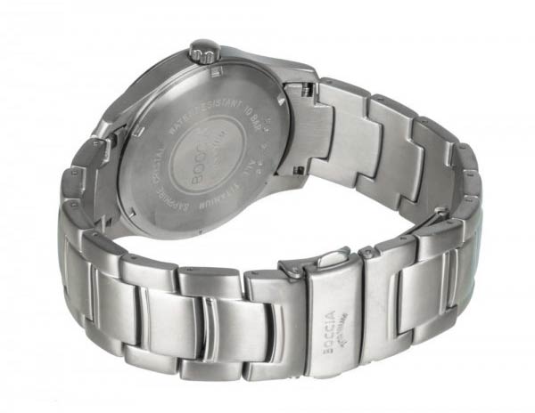 Мужские наручные часы Boccia Titanium 3626-04 с надёжным кварцевым механизмом. Корпус и браслет часов изготовлены из титана. Сапфировое стеклоСапфировое стеклоПрочный и надёжный материал из кристалла сапфира синтетического происхождения, характеризующийся особой твёрдостью и устойчивостью к царапинам и повреждениям. устойчивое к мелким механическим повреждениям. Класс водозащиты: 100 метров, позволит плавать, нырять и заниматься другими водными видами спорта. Окошко даты в положении 3 часа. Титановый браслет на раскладной застёжкеРаскладная застёжкаТакой тип застёжки используется только на браслетах из металла. Она никогда не раскрывается полностью, происходит разделение на 2 и более частей. Раскладывающая застёжка снизит вероятность потери часов к минимуму.. Стрелки и метки с люминесцентным покрытиемЛюминесцентное покрытиеПозволяет считывать показания времени в темноте. Производители наносят на стрелки, часовые индексы, безель или поверхность циферблата светонакопительный состав, дающий холодное свечение..
