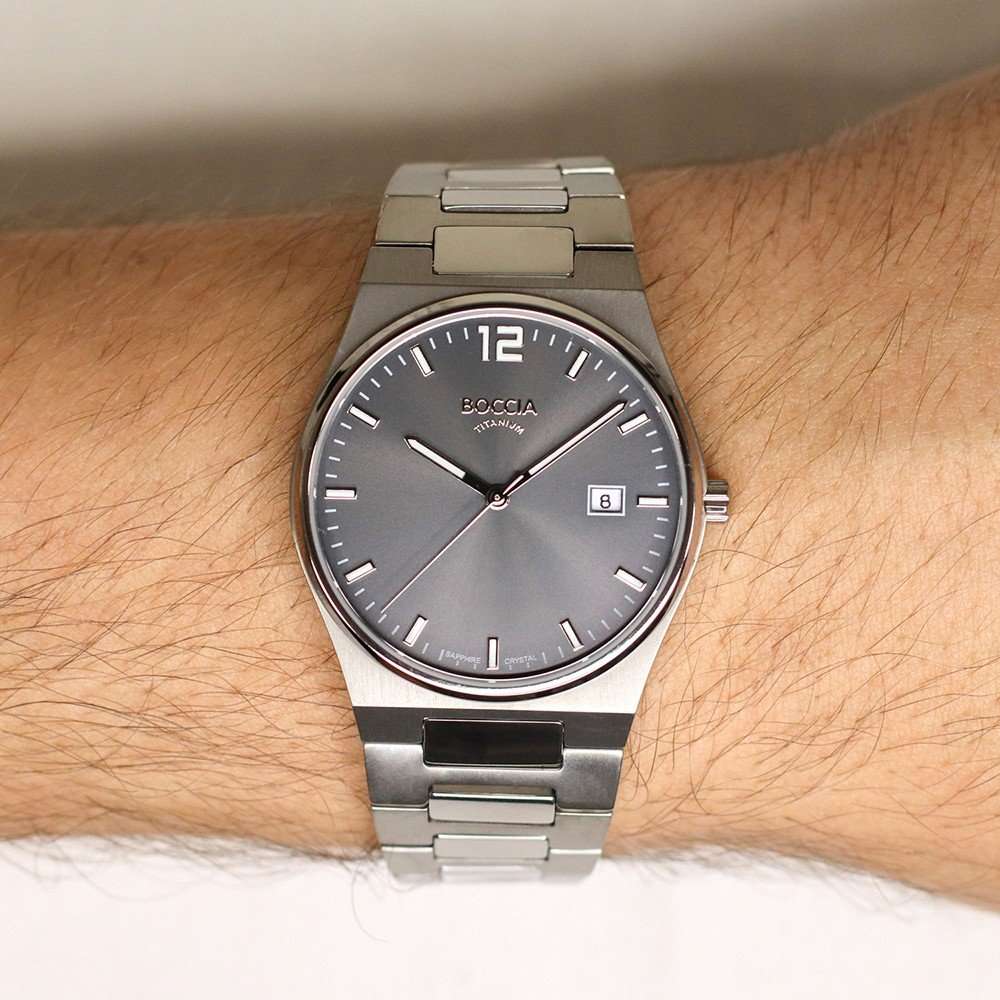 Мужские наручные часы Boccia Titanium 3661-02 с надёжным кварцевым механизмом. Корпус часов изготовлен из прочного титана диаметром 40 мм, что обеспечивает не только долговечность, но и элегантность внешнего вида. Сапфировое стеклоСапфировое стеклоПрочный и надёжный материал из кристалла сапфира синтетического происхождения, характеризующийся особой твёрдостью и устойчивостью к царапинам и повреждениям. используемое в конструкции этих часов, отличается повышенной устойчивостью к царапинам и превосходной прозрачностью, гарантируя, что циферблат всегда останется чистым и легко читаемым. Класс водозащиты: 50 метров, позволит защитить корпус от случайных брызг или капель дождя. Циферблат с метками в виде штрихов и арабской цифры 12. Окошко даты. Титановый браслет на раскладной застёжкеРаскладная застёжкаТакой тип застёжки используется только на браслетах из металла. Она никогда не раскрывается полностью, происходит разделение на 2 и более частей. Раскладывающая застёжка снизит вероятность потери часов к минимуму. обеспечивает комфортное ношение. Стрелки и метки с люминесцентным покрытиемЛюминесцентное покрытиеПозволяет считывать показания времени в темноте. Производители наносят на стрелки, часовые индексы, безель или поверхность циферблата светонакопительный состав, дающий холодное свечение..