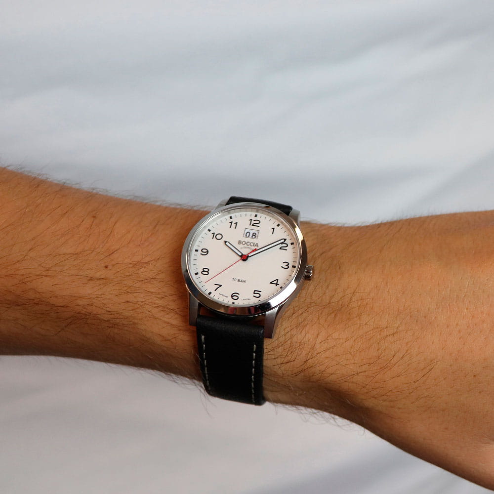 Мужские немецкие титановые часы Boccia Titanium Circle-Oval 3580-05, кварцевый механизм с высокой точностью. Сапфировое стеклоСапфировое стеклоПрочный и надёжный материал из кристалла сапфира синтетического происхождения, характеризующийся особой твёрдостью и устойчивостью к царапинам и повреждениям. устойчивое к появлению царапин, обладающее высокой прозрачностью. Корпус изготовлен из титана. Стрелки с люминесцентным покрытиемЛюминесцентное покрытиеПозволяет считывать показания времени в темноте. Производители наносят на стрелки, часовые индексы, безель или поверхность циферблата светонакопительный состав, дающий холодное свечение.. Окошко даты в положении 12 часов. Класс водозащиты: 100 метров, позволит плавать, нырять и заниматься другими водными видами спорта. Кожаный браслет на стандартной застежке.