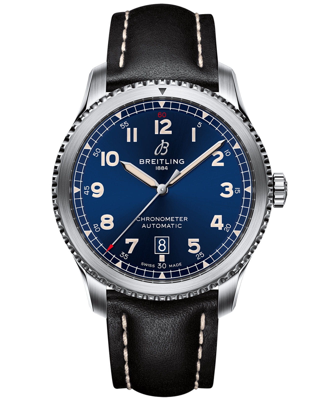 Модель Aviator 8 Automatic 41 A17315101C1X4 отличается неповторимым стилем. Эти часы – прямой потомок легендарных моделей Breitling 30–40-х годов XX века. В корпусе из нержавеющей стали с вращающимся безелем и указателем находится механизм Breitling Caliber 17. Благодаря наличию двунаправленного ротора обеспечивается запас хода более 40 часов. Удивительный циферблат выполнен в синем цвете. Хронометр диаметром 41 мм сертифицирован Швейцарским институтом официального тестирования хронографов (COSC), снабжен сплошной задней крышкой на винтовом креплении и предоставляется в комплекте с кожаным ремешком.