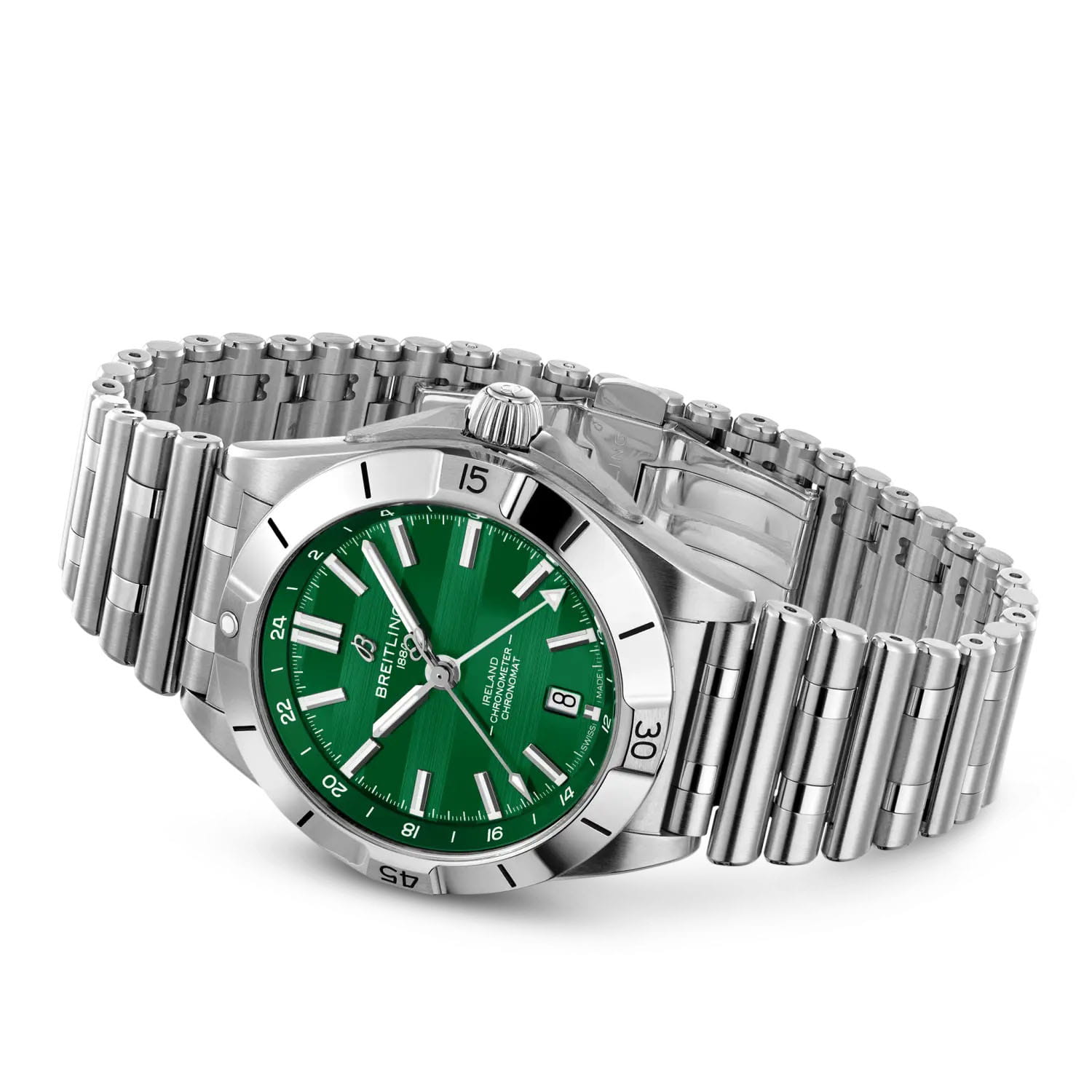 Мужские механические часы Breitling Chronomat A323987B1L1A1 — это роскошный аксессуар, сочетающий в себе классический стиль и передовые технологии. Модель выполнена из нержавеющей стали с диаметром корпуса 40 мм и толщиной 11,77 мм, что делает её прочной и устойчивой к царапинам. Циферблат зелёного цвета дополнен индикатором второго часового пояса, а его поверхность защищена выпуклым сапфировым стекломСапфировое стеклоПрочный и надёжный материал из кристалла сапфира синтетического происхождения, характеризующийся особой твёрдостью и устойчивостью к царапинам и повреждениям. с двусторонним антибликовым покрытиемАнтибликовое покрытиеСлой оксида металла в 0,13-0,3 микрон, благодаря которому стекло часов не бликует и не отражает свет. Антибликовое покрытие уменьшает отражение света в 10 раз, обеспечивая отличную читаемость показателей циферблата., устойчивым к повреждениям. Задняя крышка завинчивается, а заводная головка завинченная, с двумя прокладками, что обеспечивает надёжную фиксацию на запястье. Часы оснащены автоматическим механизмом Breitling Caliber 32, обеспечивающим запас хода до 42 часов и частоту колебаний 28 800 полуколебаний в час. Функции включают отображение времени и второй часовой пояс. Водонепроницаемость позволяет использовать модель при плавании и других водных активностях без глубокого погружения. Браслет из нержавеющей стали шириной 20 мм оснащён застёжкой «бабочка» с кнопкамиЗастёжка "бабочка"Такой вид застёжки дополняется предохранителями, помогающими избежать случайного раскрытия браслета. Обладают изящным исполнением. , обеспечивающей комфорт и надёжную фиксацию на запястье. На задней крышке выгравирован логотип команды, которой посвящена модель, и надпись «Один из 250». Это лимитированная серия, выпущенная всего 250 экземпляров, что подчёркивает её уникальность. Гарантия 2 года подтверждает качество и долговечность изделия. Эти часы станут универсальным аксессуаром для тех, кто ценит сочетание стиля, функциональности и надёжности — идеальный выбор для повседневной носки и активного образа жизни.