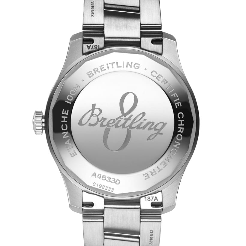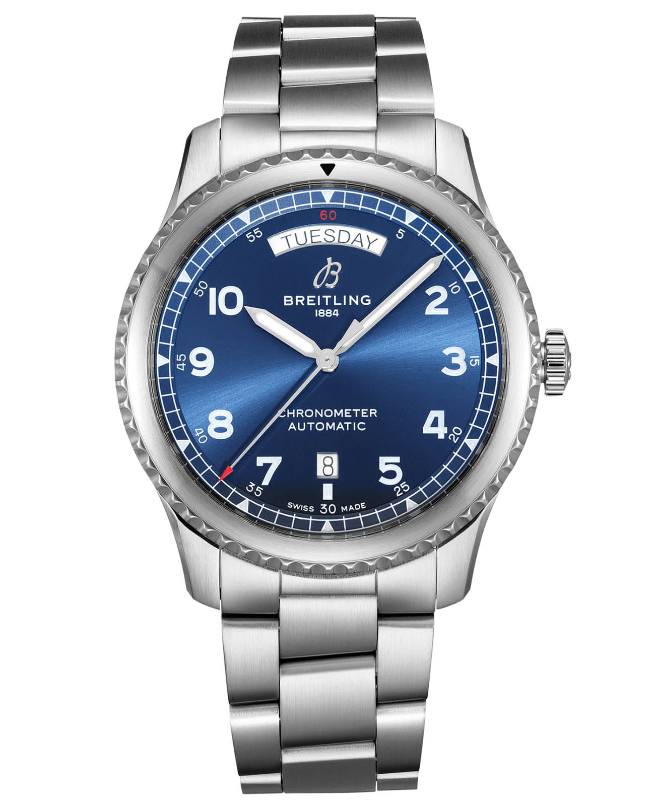 Модель Aviator 8 Automatic Day & Date 41 A45330101C1A1 отображает день недели, дату и время. Индикатор дня недели размещен в положении «12 часов» симметрично дате, в положении «6 часов». «Сердцем» модели этих автоматических наручных часов является калибр Breitling Caliber 45, а двунаправленный ротор автоподзавода обеспечивает запас хода свыше 40 часов.