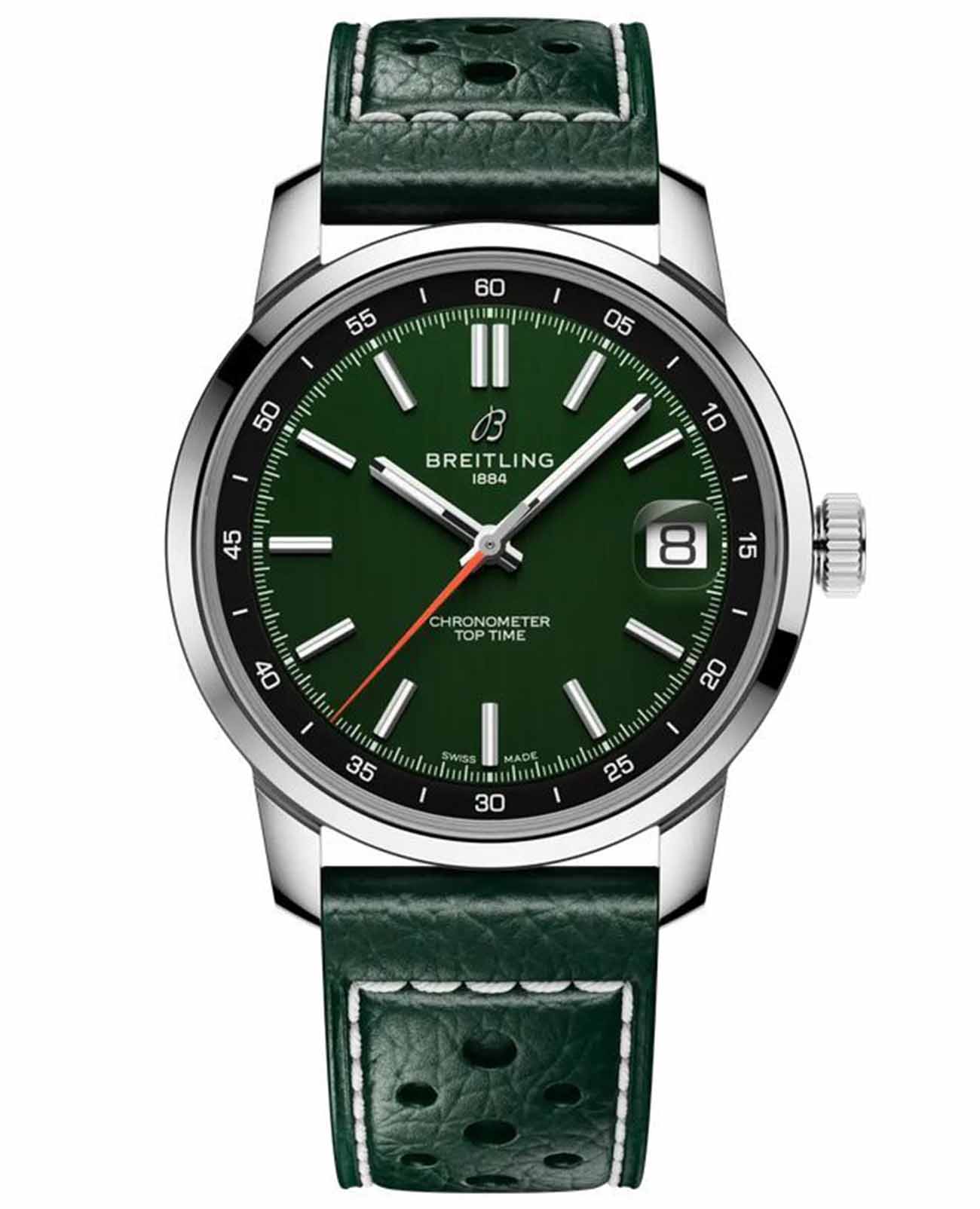 Breitling Top Time B31 AB3113171L1X1 — стильная новинка 2025 года с характерной винтажной эстетикой и современным механизмом собственного производства. Корпус диаметром 38 мм выполнен из нержавеющей стали с полированной отделкой. Прозрачная задняя крышка позволяет наблюдать за работой механизма. Циферблат защищён выпуклым сапфировым стекломСапфировое стеклоПрочный и надёжный материал из кристалла сапфира синтетического происхождения, характеризующийся особой твёрдостью и устойчивостью к царапинам и повреждениям. с двухсторонним антибликовым покрытиемАнтибликовое покрытиеСлой оксида металла в 0,13-0,3 микрон, благодаря которому стекло часов не бликует и не отражает свет. Антибликовое покрытие уменьшает отражение света в 10 раз, обеспечивая отличную читаемость показателей циферблата.. Зелёный циферблат с контрастным внутренним кольцом и яркой оранжевой секундной стрелкой оформлен в узнаваемом стиле коллекции Top Time. Стрелки и часовые метки имеют люминесцентное покрытиеЛюминесцентное покрытиеПозволяет считывать показания времени в темноте. Производители наносят на стрелки, часовые индексы, безель или поверхность циферблата светонакопительный состав, дающий холодное свечение., обеспечивающее отличную читаемость. Внутри установлен автоматический калибр Breitling B31, отображающий часы, минуты, малую секунду и дату. Механизм обеспечивает запас хода до 78 часов и работает с частотой 28 800 полуколебаний в час. Часы укомплектованы перфорированным кожаным ремешком зелёного цвета с классической застёжкой-пряжкой. Водонепроницаемость 100 метров делает модель универсальной для повседневного использования. Top Time B31 AB3113171L1X1 — гармония винтажного дизайна и инновационного часового мастерства.