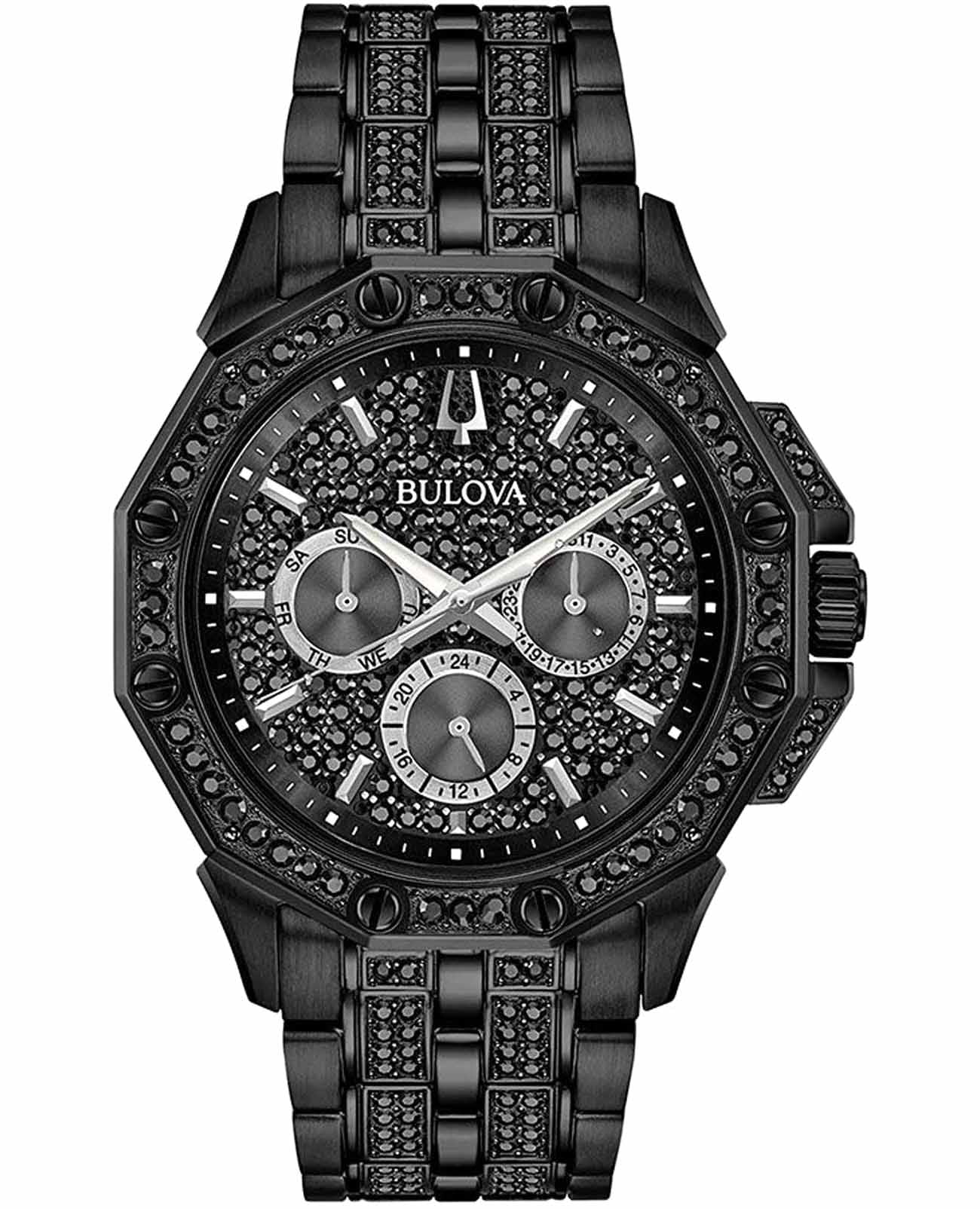 Мужские кварцевые часы Bulova Octava 98C134 – отражающий идеальное сочетание современного дизайна, надёжности и функциональности. Элегантный облик станет превосходным завершением образа, наделив его индивидуальным характером. Корпус из нержавеющей стали с IP-покрытиемIP-покрытиеМетод ионного напыления. Демонстрирует повышенную устойчивость к истиранию, окислению и химическим веществам. Под воздействием высокого давления и температуры около 1500°C молекулы металла надёжно соединяются с частицами корпуса часов. черного цвета, диаметром 41.5 мм идеально сбалансирован и элегантен. Минеральное стеклоМинеральное стеклоМинеральное стекло представляет собой искусственно выращенный минерал кварца. Такое стекло отличается особой устойчивостью к повреждениям и царапинам. Уступает по некоторым качествам сапфировому стеклу. защищает циферблат от царапин и устойчиво к мелким механическим повреждениям. БезельБезельВнешний ободок, закрепляющий стекло. В спортивных часах так называется поворотное кольцо с делениями на циферблате, выполняет роль таймера – замеряет отрезки времени на шкале. Неподвижный безель – элемент декора. Однонаправленно вращающийся безель на дайверских часах позволяет фиксировать моменты погружения и выныривания на поверхность., браслет и циферблат покрыты 308 кристаллами. Стальной браслет на застёжке-бабочке с кнопкамиЗастёжка "бабочка"Такой вид застёжки дополняется предохранителями, помогающими избежать случайного раскрытия браслета. Обладают изящным исполнением. обеспечивает комфортное ношение. 12/24х часовой формат времени. Стрелки с люминесцентным покрытиемЛюминесцентное покрытиеПозволяет считывать показания времени в темноте. Производители наносят на стрелки, часовые индексы, безель или поверхность циферблата светонакопительный состав, дающий холодное свечение.. Заводная головка с защитой. Водозащита 30 метров позволит защитить корпус от случайных брызг или капель дождя. Эта модель – отличный выбор для тех, кто ищет сочетание стиля, качества и функциональности. Часы станут не только полезным аксессуаром, но и выразительным элементом вашего имиджа.
