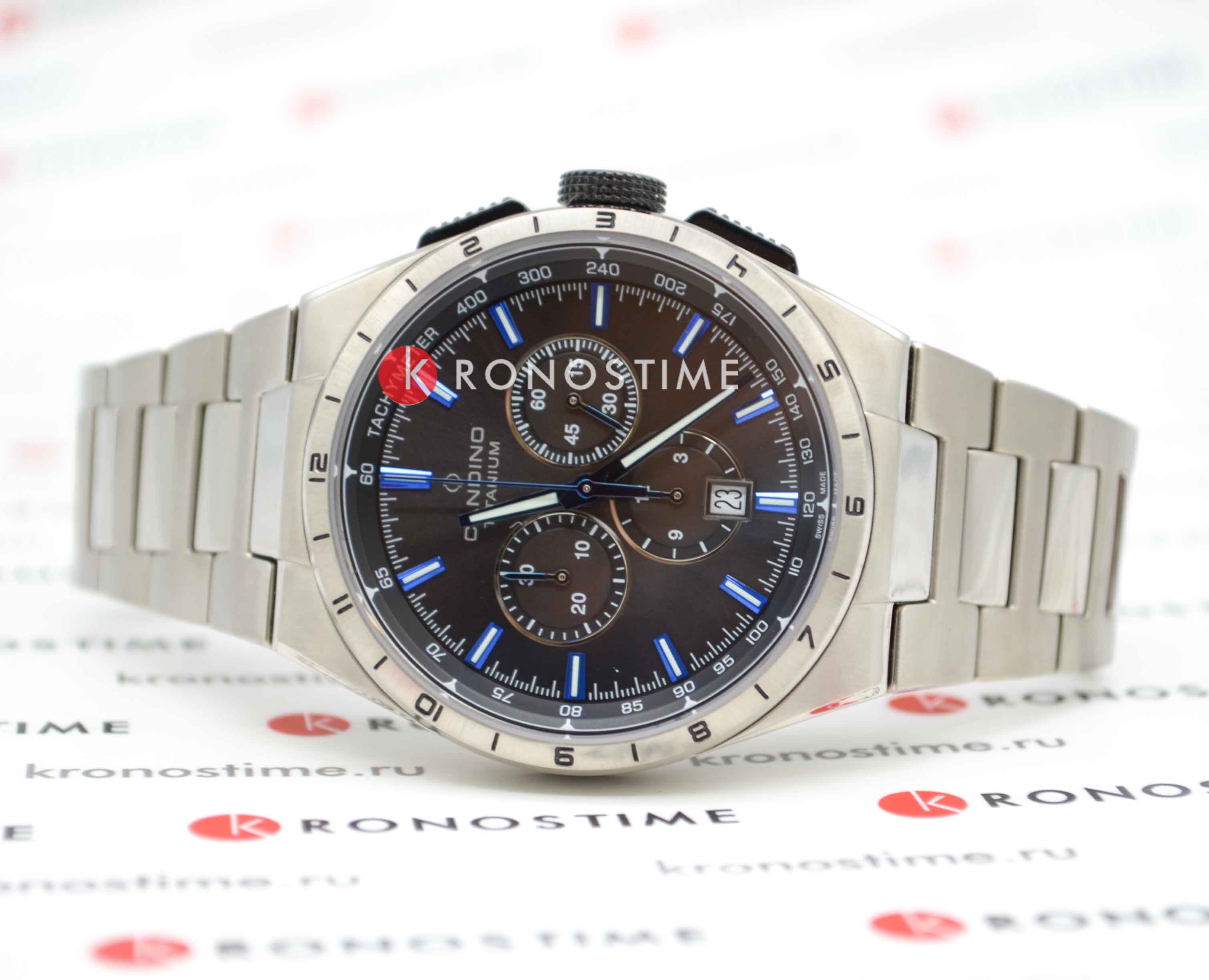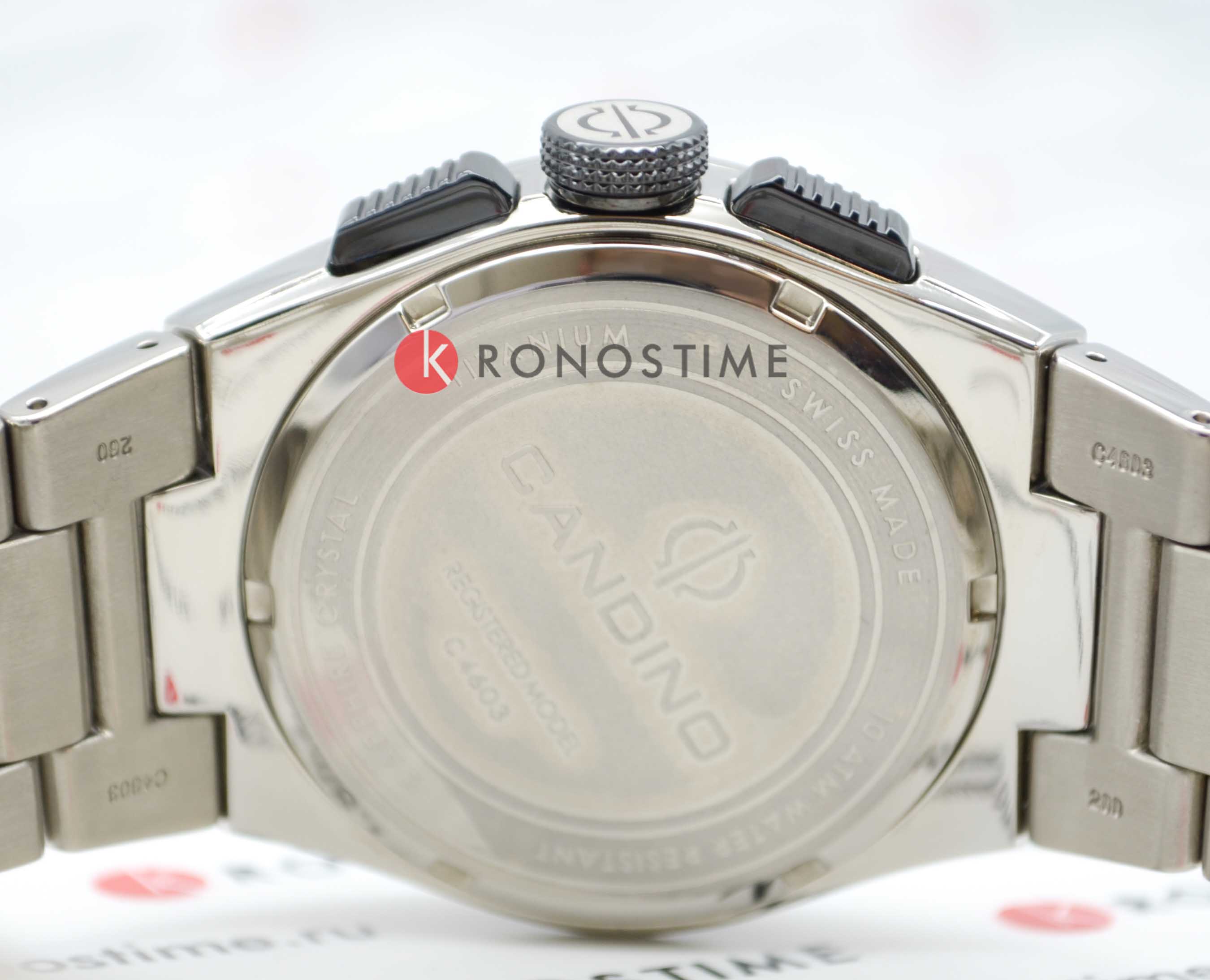 Швейцарские мужские наручные часы-хронографХронографФункция позволяет измерять отрезки времени с особой точностью: часы, минуты, секунды. Верным признаком хронографа является наличие на циферблате 3 дополнительных окошек-счётчиков. с секундомеромСекундомерСекундоме́р — прибор, способный измерять интервалы времени с точностью до долей секунды. Candino Titanium Chrono C4603/E, кварцевый механизм с высокой точностью. Сапфировое стеклоСапфировое стеклоПрочный и надёжный материал из кристалла сапфира синтетического происхождения, характеризующийся особой твёрдостью и устойчивостью к царапинам и повреждениям. устойчивое к появлению царапин, обладающее высокой прозрачностью. Класс водозащиты: 100 метров, позволит плавать, нырять и заниматься другими водными видами спорта. Корпус часов изготовлен из титана. Титановый браслет на раскладной застёжкеРаскладная застёжкаТакой тип застёжки используется только на браслетах из металла. Она никогда не раскрывается полностью, происходит разделение на 2 и более частей. Раскладывающая застёжка снизит вероятность потери часов к минимуму.. Стрелки и метки с люминесцентным покрытиемЛюминесцентное покрытиеПозволяет считывать показания времени в темноте. Производители наносят на стрелки, часовые индексы, безель или поверхность циферблата светонакопительный состав, дающий холодное свечение.. Окошко даты находится в положении 6 часов.