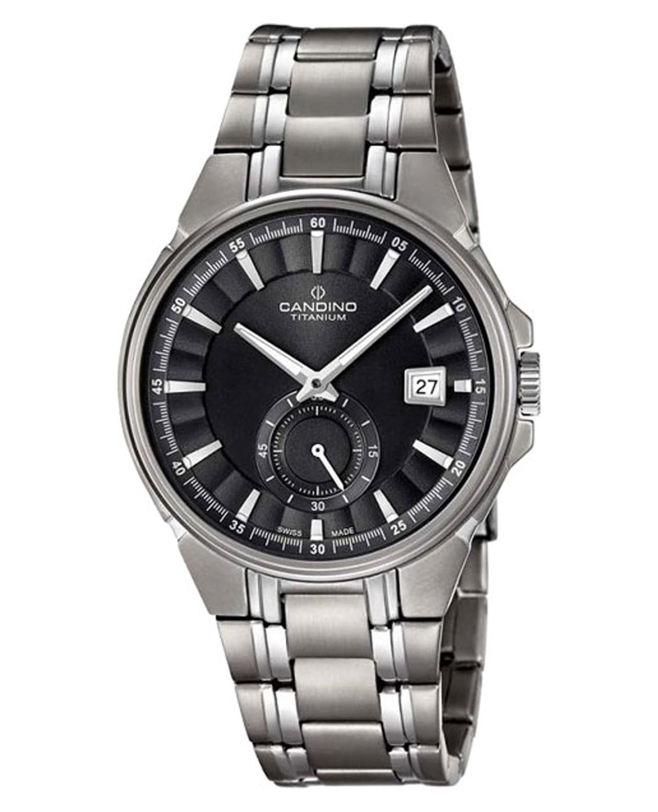 Швейцарские мужские наручные часы Candino Titanium C4604/4, кварцевый механизм с высокой точностью. Сапфировое стеклоСапфировое стеклоПрочный и надёжный материал из кристалла сапфира синтетического происхождения, характеризующийся особой твёрдостью и устойчивостью к царапинам и повреждениям. устойчивое к появлению царапин, обладающее высокой прозрачностью. Корпус часов изготовлен из титана. Секундная стрелка вынесена на отдельный циферблат. Стрелки и метки с люминесцентным покрытиемЛюминесцентное покрытиеПозволяет считывать показания времени в темноте. Производители наносят на стрелки, часовые индексы, безель или поверхность циферблата светонакопительный состав, дающий холодное свечение.. Окошко даты находится в положении 3 часов. Класс водозащиты: 50 метров, позволит защитить корпус от случайных брызг или капель дождя. Титановый браслет на раскладной застёжкеРаскладная застёжкаТакой тип застёжки используется только на браслетах из металла. Она никогда не раскрывается полностью, происходит разделение на 2 и более частей. Раскладывающая застёжка снизит вероятность потери часов к минимуму..