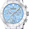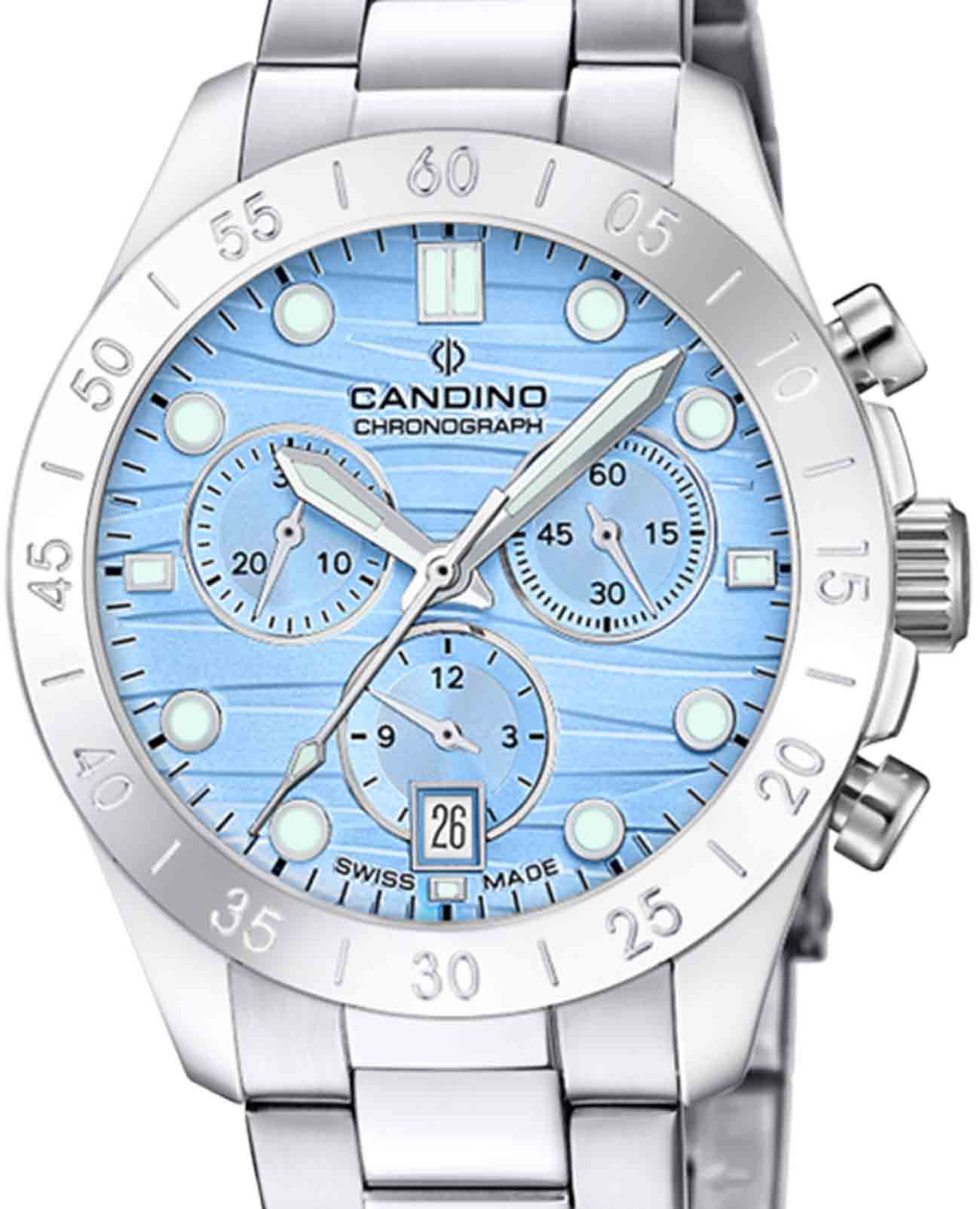 Женские часы Candino Chronos C4783/3 — сочетание элегантности и функциональности для современных женщин. Эти стильные часы-хронографХронографФункция позволяет измерять отрезки времени с особой точностью: часы, минуты, секунды. Верным признаком хронографа является наличие на циферблате 3 дополнительных окошек-счётчиков. с секундомеромСекундомерСекундоме́р — прибор, способный измерять интервалы времени с точностью до долей секунды. оснащены кварцевым механизмом, обеспечивающим точность и надежность. На безелеБезельВнешний ободок, закрепляющий стекло. В спортивных часах так называется поворотное кольцо с делениями на циферблате, выполняет роль таймера – замеряет отрезки времени на шкале. Неподвижный безель – элемент декора. Однонаправленно вращающийся безель на дайверских часах позволяет фиксировать моменты погружения и выныривания на поверхность. выгравирована секундная шкала. Голубой циферблат с функцией отображения даты в районе 6 часов добавляет модели изысканности и позволяет легко отслеживать дату. Корпус диаметром 39 мм выполнен из прочной нержавеющей стали, что гарантирует долговечность и устойчивость к внешним воздействиям. Сапфировое стеклоСапфировое стеклоПрочный и надёжный материал из кристалла сапфира синтетического происхождения, характеризующийся особой твёрдостью и устойчивостью к царапинам и повреждениям. защищает циферблат, обеспечивая высокую степень защиты от царапин и сохраняя первозданный вид часов. Стрелки и метки с люминесцентным покрытиемЛюминесцентное покрытиеПозволяет считывать показания времени в темноте. Производители наносят на стрелки, часовые индексы, безель или поверхность циферблата светонакопительный состав, дающий холодное свечение., что облегчает чтение времени даже в условиях слабого освещения. Стальной браслет на раскладной застёжкеРаскладная застёжкаТакой тип застёжки используется только на браслетах из металла. Она никогда не раскрывается полностью, происходит разделение на 2 и более частей. Раскладывающая застёжка снизит вероятность потери часов к минимуму. добавляет современный штрих и комфортно сидит на запястье, идеально подходя для повседневного ношения. С водонепроницаемостью до 100 метров эти часы подходят для активного образа жизни, позволяя не беспокоиться о случайных контактах с водой, таких как плавание или дождь.
