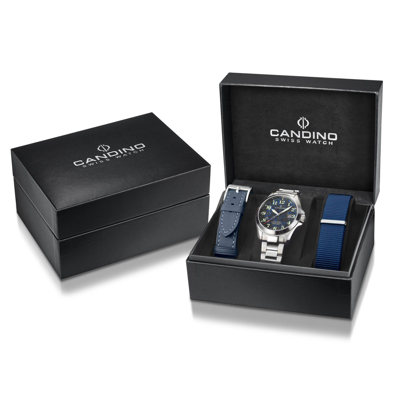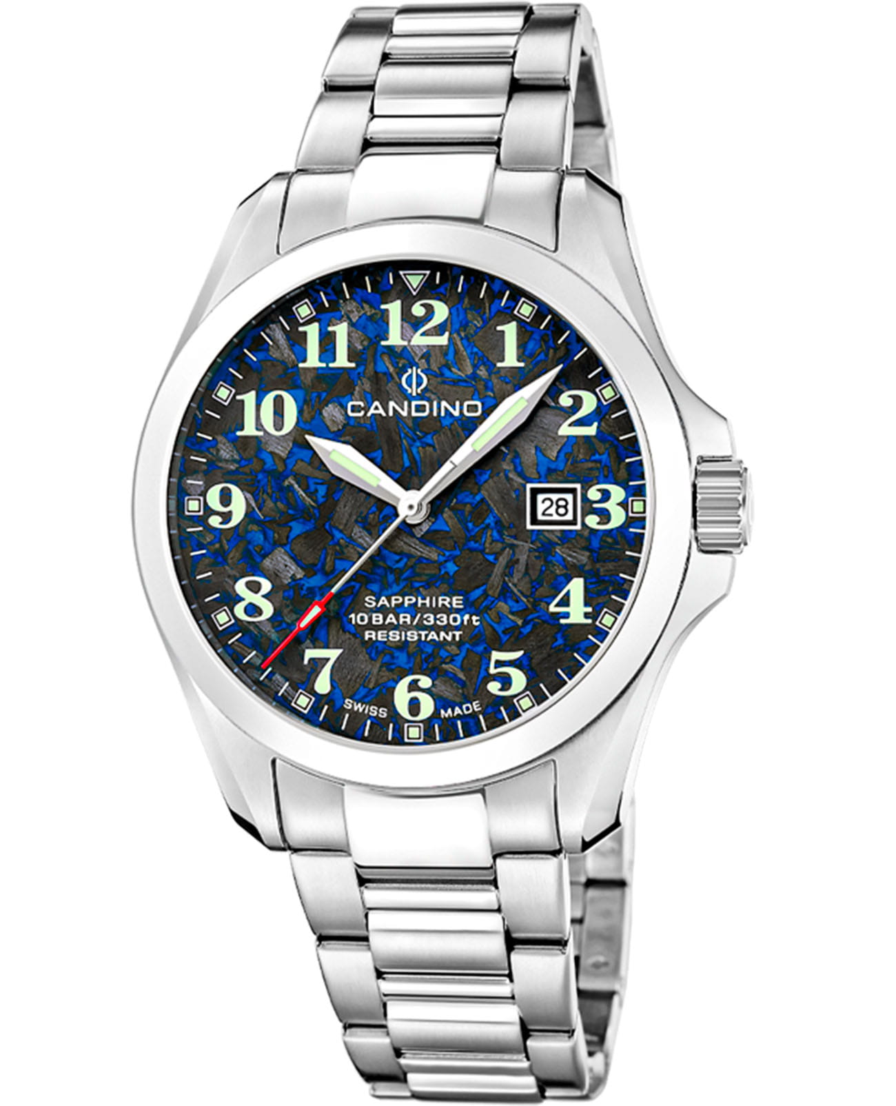 Мужские кварцевые часы Candino C4785/2 — это стильный и надёжный аксессуар швейцарского производства, подчёркивающий индивидуальность и хороший вкус. Корпус круглой формы выполнен из нержавеющей стали и защищён сапфировым стекломСапфировое стеклоПрочный и надёжный материал из кристалла сапфира синтетического происхождения, характеризующийся особой твёрдостью и устойчивостью к царапинам и повреждениям., устойчивым к царапинам. Циферблат оформлен арабскими цифрами, а стрелки и метки оснащены люминесцентным покрытиемЛюминесцентное покрытиеПозволяет считывать показания времени в темноте. Производители наносят на стрелки, часовые индексы, безель или поверхность циферблата светонакопительный состав, дающий холодное свечение., обеспечивающим хорошую читаемость в темноте. Окошко даты расположено на отметке 3 часа, что делает часы не только элегантными, но и функциональными. Часы оснащены стальным браслетом серебристого цвета с раскладной застёжкойРаскладная застёжкаТакой тип застёжки используется только на браслетах из металла. Она никогда не раскрывается полностью, происходит разделение на 2 и более частей. Раскладывающая застёжка снизит вероятность потери часов к минимуму., который обеспечивает комфорт при ношении. Водонепроницаемость 100 м позволяет использовать часы в повседневных условиях, включая плавание. Модель сочетает в себе классический стиль, швейцарское качество и надёжность, оставаясь универсальным выбором для любого случая. В комплекте предусмотрены два ремешка из кожи и текстиля.