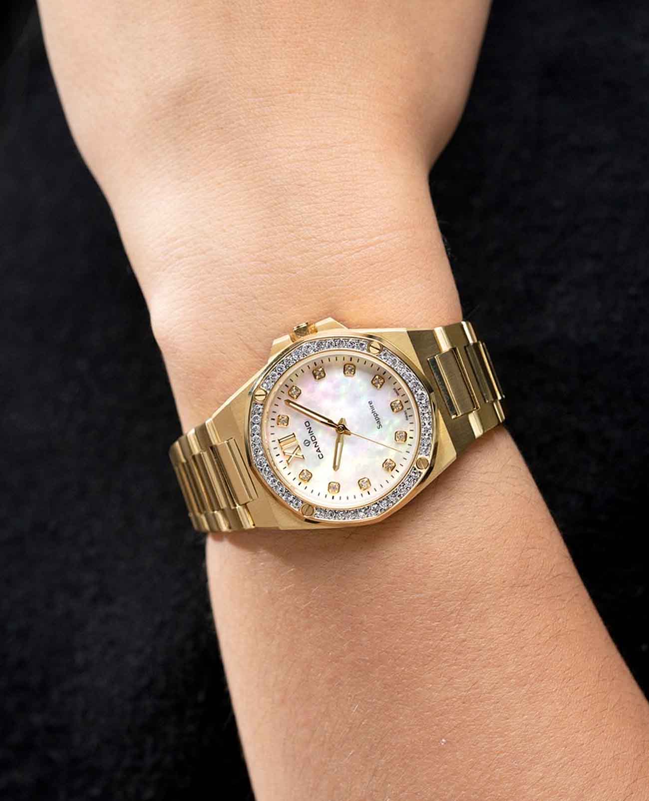 Женские кварцевые часы с автоподзаводом Candino Lady Elegance Date C4755/1. Сапфировое стеклоСапфировое стеклоПрочный и надёжный материал из кристалла сапфира синтетического происхождения, характеризующийся особой твёрдостью и устойчивостью к царапинам и повреждениям. повышенной прозрачности, устойчивое к мелким механическим повреждениям. Корпус изготовлен из нержавеющей стал с PVD-покрытиемPVDУльтратонкое покрытие наносится в технике вакуумного напыления, сочетает в себе нитрид титана особой прочности со слоем золота или оксида хрома. Несёт в себе декоративную или защитную функцию.. Стрелки с люминесцентным покрытиемЛюминесцентное покрытиеПозволяет считывать показания времени в темноте. Производители наносят на стрелки, часовые индексы, безель или поверхность циферблата светонакопительный состав, дающий холодное свечение.. Циферблат инкрустирован кристаллами. Класс водозащиты: 50 метров, позволит защитить корпус от случайных брызг или капель дождя. Окошко даты находится в положении 3 часа. Стальной браслет с PVD-покрытиемPVDУльтратонкое покрытие наносится в технике вакуумного напыления, сочетает в себе нитрид титана особой прочности со слоем золота или оксида хрома. Несёт в себе декоративную или защитную функцию. на раскладной застёжкеРаскладная застёжкаТакой тип застёжки используется только на браслетах из металла. Она никогда не раскрывается полностью, происходит разделение на 2 и более частей. Раскладывающая застёжка снизит вероятность потери часов к минимуму..