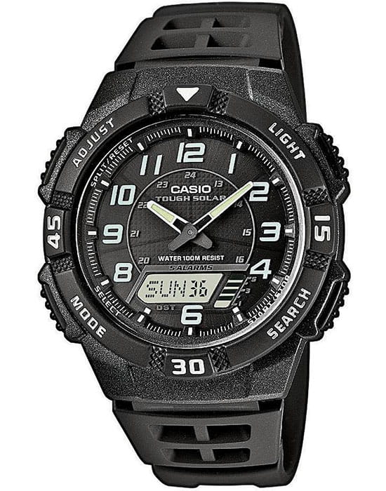Прочный пластиковый корпус соединен с гибким ремешком из полимерного материала. Светодиодная подсветкаСветодиодная подсветкаСветодиодная или LED-подсветка обеспечивает появление яркого холодного свечения за счёт LED-элементов - маленьких лампочек. Они потребляют минимальное количество энергии, чаще всего можно встретить 1 светодиод, в нижней части циферблата. позволяет видеть циферблат в темное время суток. Высокая точность отсчета - секундомер измеряет прошедшее время с точностью в 1/100 секунды. Есть 2 независимых таймера с обратным отсчетом. Для удобства время отображается в 12-часовом и 24-часовом формате. Не пропустить ни одно важное событие помогут 5 ежедневных будильника. Выпуклое стекло из пластика надежно защищает изделие от повреждений. Высокая водонепроницаемость в 10 Бар идеально подходит для плавания. Кварцевый механизм. Источником питания для часов служит солнечная батарейка, которая работает от преобразованного в электроэнергию света.