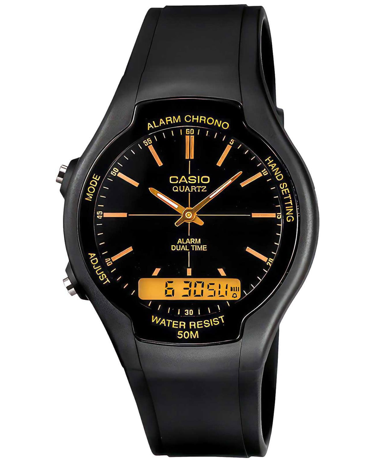 В изготовлении использованы современные полимерные материалы. Время отображается в 12- и 24-часовом форматах. СекундомерСекундомерСекундоме́р — прибор, способный измерять интервалы времени с точностью до долей секунды. измеряет прошедшее время с точностью в 1/100 секунды. Водонепроницаемость в 50 WR. Стрелки с люминесцентным покрытиемЛюминесцентное покрытиеПозволяет считывать показания времени в темноте. Производители наносят на стрелки, часовые индексы, безель или поверхность циферблата светонакопительный состав, дающий холодное свечение.. Пластиковый ремешок на стандартной застёжке.
