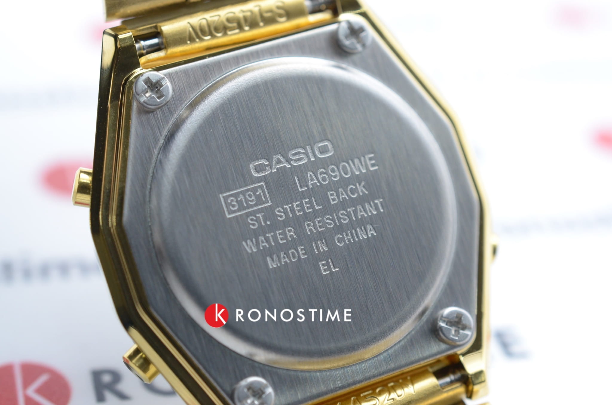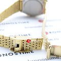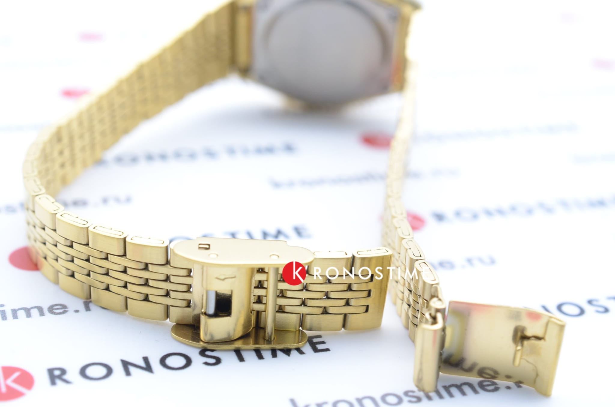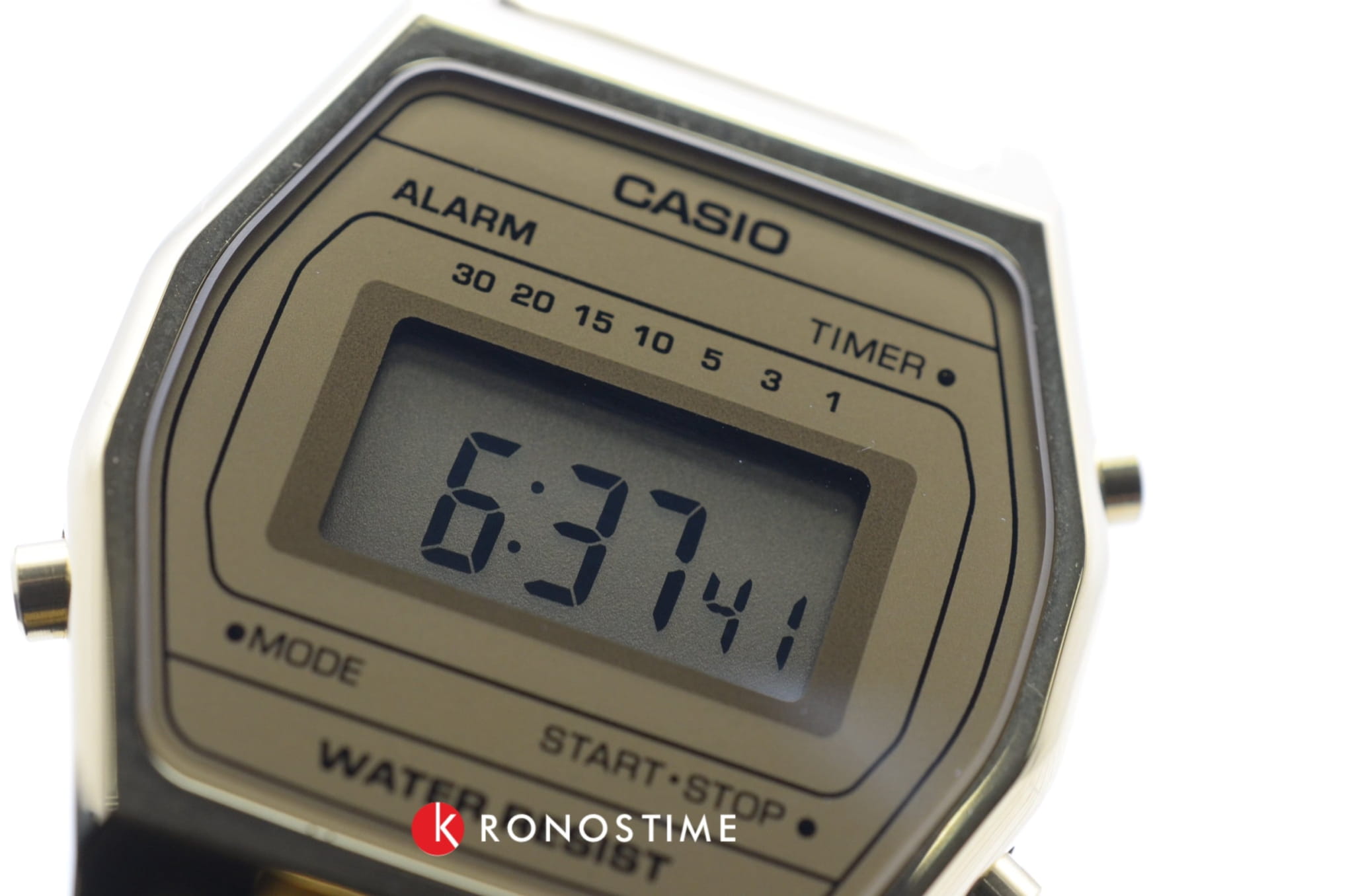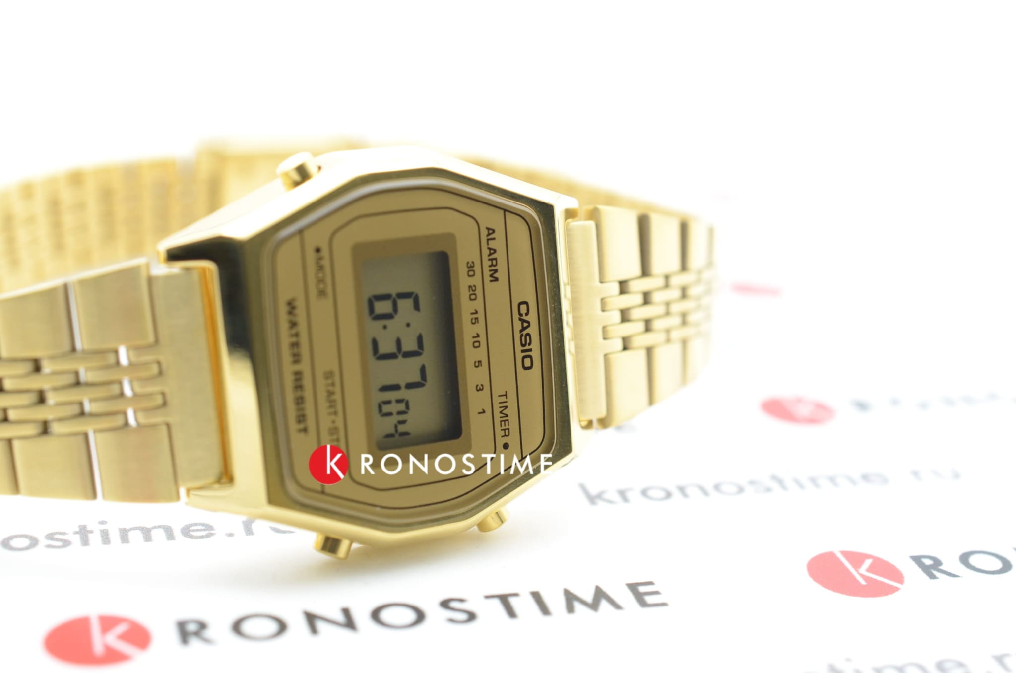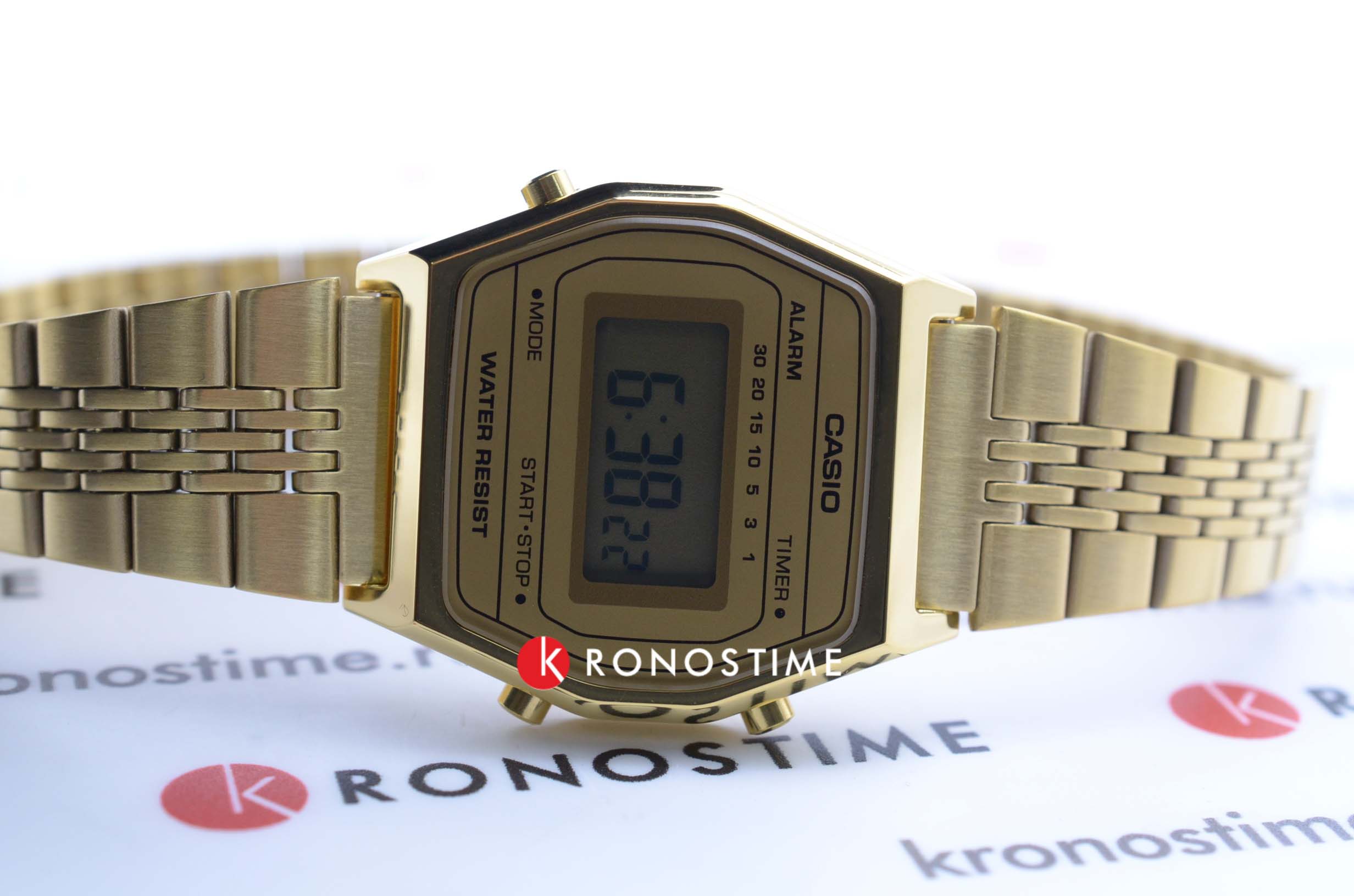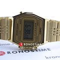 Женские электронные часы. Оснащены функциями: секундомера, таймера, календаря и подсветки. Корпус - Пластиковый; Стекло - Пластик; Водозащита - 30 м. (WR 30); Материал ремешка - Нержавеющая сталь, PVD покрытие; Цвет ремешка - Золотистый; Цвет циферблата - Золотой.