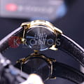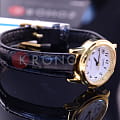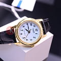 Черный ремень наручных часов сделан из натуральной, мягкой кожи. Круглый, блестящий корпус золотого цвета сделан из гипоаллергенной латуни. На белом циферблате расположены отчетливые арабские цифры черного цвета. Прочное минеральное стекло надежно защищает часы от повреждений. Аксессуар станет красивым дополнением к любому образу и отлично подойдет как на праздничный выход, так и на каждый день.