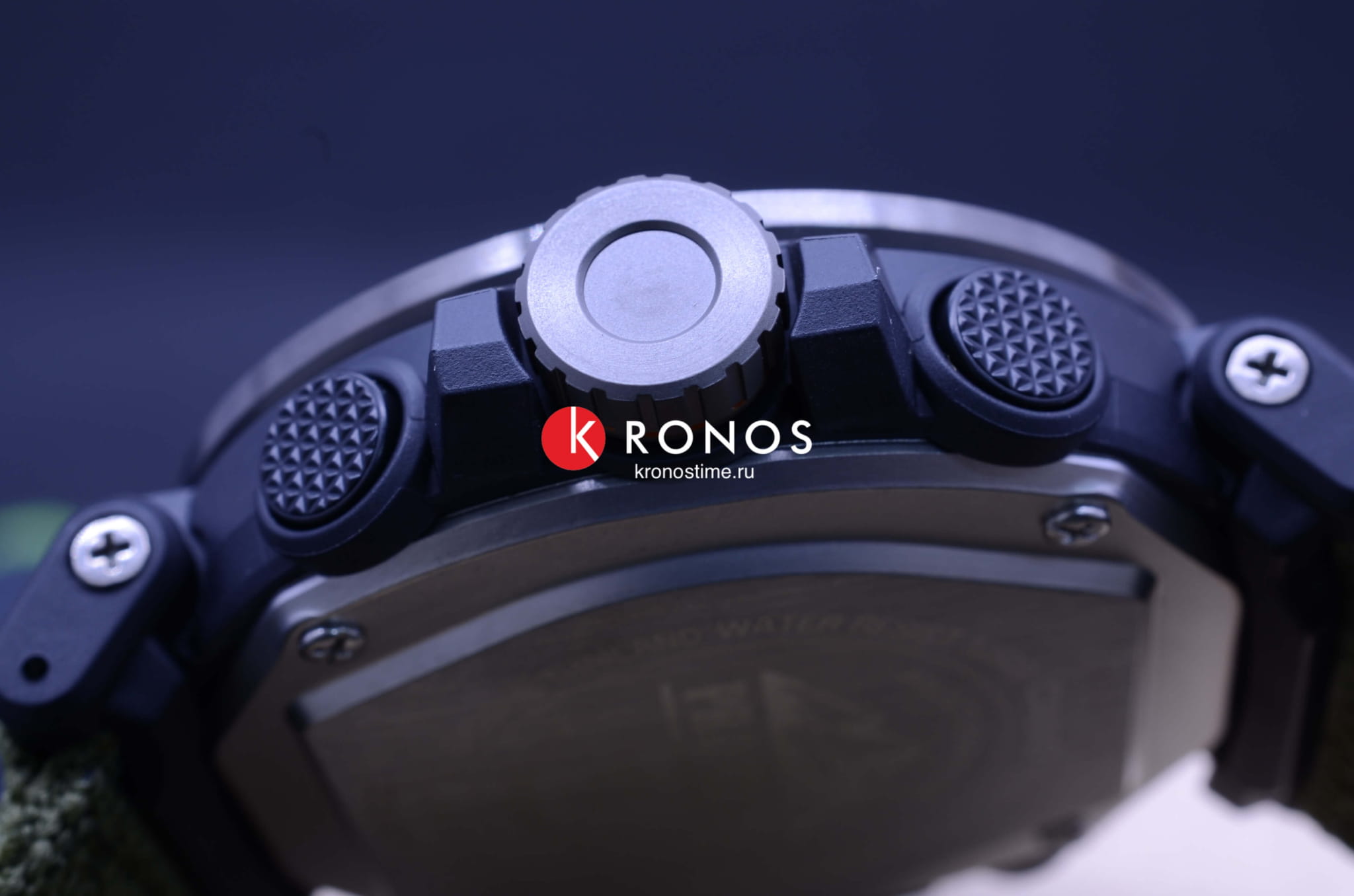 , секундомер, хронографХронографФункция позволяет измерять отрезки времени с особой точностью: часы, минуты, секунды. Верным признаком хронографа является наличие на циферблате 3 дополнительных окошек-счётчиков., календарь, мировое времяМировое время Полезное часовое усложнение, отображающее время в основных городах и известных областях по всему миру, оно связано с часовыми поясами, удобно для путешественников и бизнесменов. – 29 часовых поясов. Это часы на солнечной батарее , функция сохранения энергии позволяет модели работать без подзарядки на протяжении 25 месяцев. Текстильный ремешок цвета хаки. Ударопрочный корпусУдаропрочный корпусМеханизм заключён в корпус, выполненный из современных материалов, устойчивых к ударам, механическим повреждениям и падению с высоты: инновационный пластик, карбон, нержавеющая сталь, титан. из пластика и стали 316L с IP-покрытиемIP-покрытиеМетод ионного напыления. Демонстрирует повышенную устойчивость к истиранию, окислению и химическим веществам. Под воздействием высокого давления и температуры около 1500°C молекулы металла надёжно соединяются с частицами корпуса часов.. Минеральное стекло. Устойчивость к температурам ниже -10°C. Двойная светодиодная подсветкаСветодиодная подсветкаСветодиодная или LED-подсветка обеспечивает появление яркого холодного свечения за счёт LED-элементов - маленьких лампочек. Они потребляют минимальное количество энергии, чаще всего можно встретить 1 светодиод, в нижней части циферблата.. Класс водостойкости WR 100. Габариты: 51,6 x 51,5 x 13,4 мм.