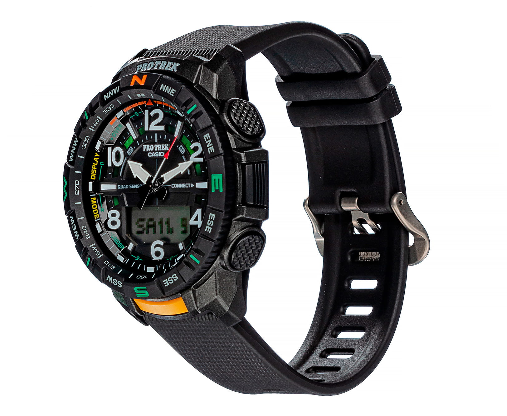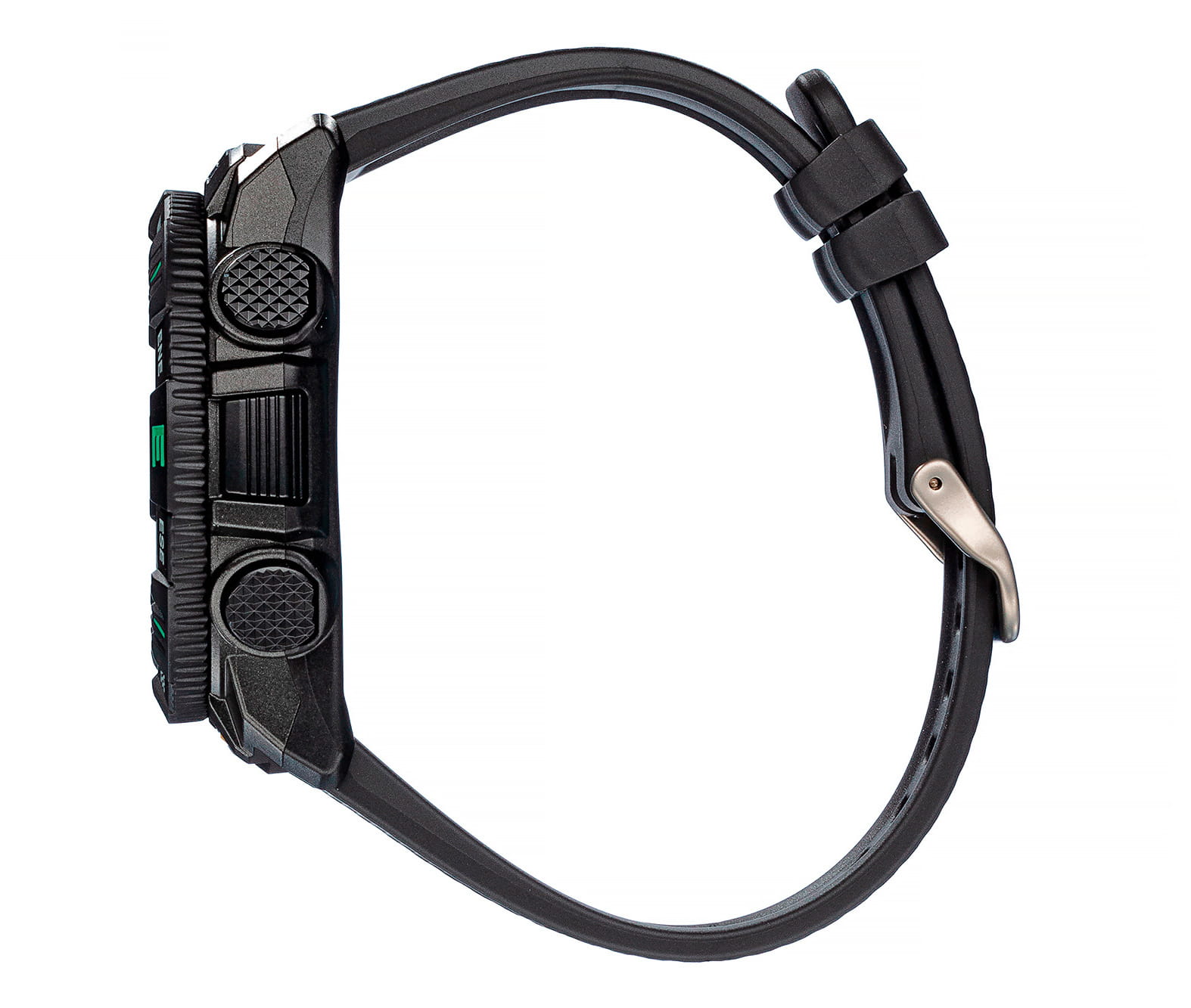 , будильник, хронографХронографФункция позволяет измерять отрезки времени с особой точностью: часы, минуты, секунды. Верным признаком хронографа является наличие на циферблате 3 дополнительных окошек-счётчиков., поиск телефона. Часы синхронизируются со смартфоном с помощью технологии Bluetooth® SmartBluetoothСовременная технология, позволяющая синхронизировать часы с телефоном и переносить данные. Часы с Bluetooth расширяют возможности вашего смартфона и делают его использование ещё более удобным.. Японский кварцевый механизм. Срок службы батарейки – 2 года. Минеральное стекло. Двойная электролюминесцентная подсветкаЭлектролюминесцентная подсветкаЭлектролюминесцентная панель устанавливается под ЖК-экраном часов, при нажатии кнопки электричество преобразуется в свет за счёт подачи напряжения на атомы фосфора, такой тип подсветки позволяет освещать весь циферблат.. Отключение и включение звука кнопок. Сохранение работоспособности при температуре ниже -10°C. Водозащита 100 метров. Ударопрочный корпусУдаропрочный корпусМеханизм заключён в корпус, выполненный из современных материалов, устойчивых к ударам, механическим повреждениям и падению с высоты: инновационный пластик, карбон, нержавеющая сталь, титан. и ремешок из полимерного материала. Габариты: 57,5 x 50,8 x 15,8 мм.