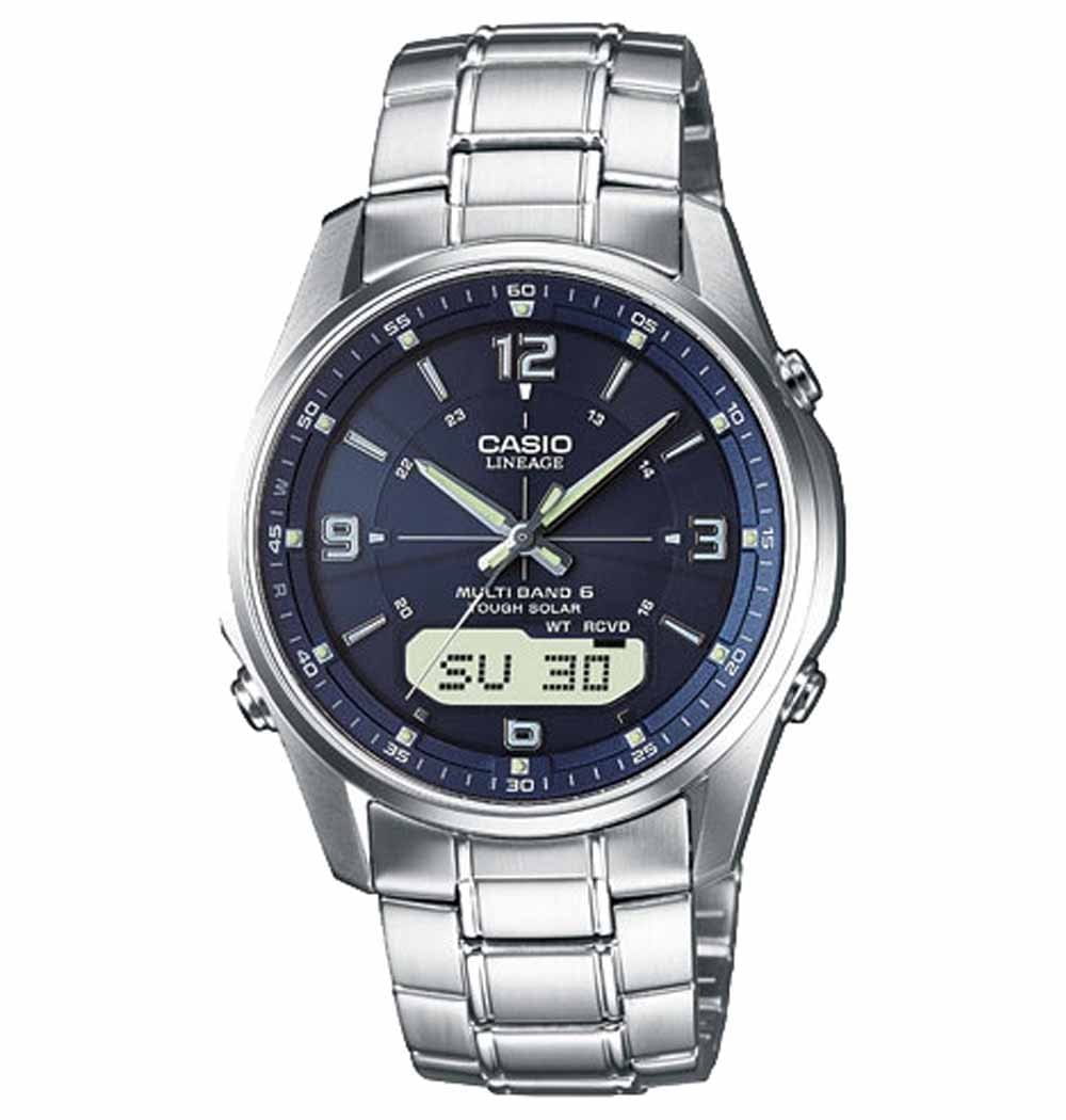 Высокотехнологичные японские наручные мужские часы. Круглый корпус и браслет часов выполнены из нержавеющей стали. Водонепроницаемость 10 ATM.  Круглый циферблат синего цвета. Часы оснащены такими функциями как секундомер, таймер обратного отсчета, будильник, мировое время, второй часовой пояс, прием радиосигнала. Сапфировое стекло не царапается.