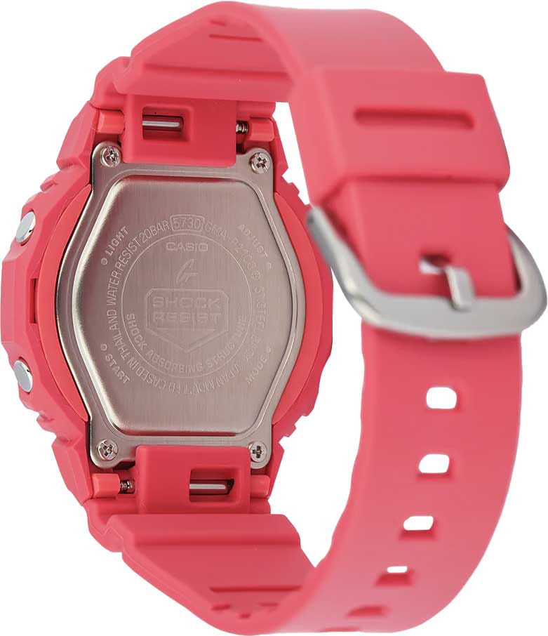 Женские кварцевые часы Casio G-Shock GMA-P2100-4ADR (GMA-P2100-4A). Корпус часов изготовлен из пластика. Стрелки с люминесцентным покрытиемЛюминесцентное покрытиеПозволяет считывать показания времени в темноте. Производители наносят на стрелки, часовые индексы, безель или поверхность циферблата светонакопительный состав, дающий холодное свечение.. Водозащита: 200 метров, позволит плавать, нырять и заниматься другими водными видами спорта. Минеральное стеклоМинеральное стеклоМинеральное стекло представляет собой искусственно выращенный минерал кварца. Такое стекло отличается особой устойчивостью к повреждениям и царапинам. Уступает по некоторым качествам сапфировому стеклу. устойчивое к появлению царапин, обладающее высокой прозрачностью. Необритовое светонакопительное покрытие обеспечивает длительное послесвечение в темноте даже после кратковременного нахождения на свету. 12-ти и 24-х часовой формат времени. Секундомер с двумя точностями показаний: 1/100с (до 1ч) и 1с (после 1ч) и временем измерения 24ч. SPLIT-хронограф. Таймер обратного отсчета от 1с до 24ч. Мировое время – 48 городов (31 часовой пояс), всемирное координированное время (UTC). Пластиковый ремешок с классической застежкой.