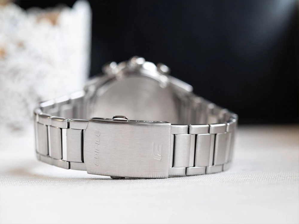 Мужские японские часы-хронографХронографФункция позволяет измерять отрезки времени с особой точностью: часы, минуты, секунды. Верным признаком хронографа является наличие на циферблате 3 дополнительных окошек-счётчиков. Casio Edifice EFR-573D-2A, кварцевый механизм с высокой точностью. Класс водозащиты: 100 метров, позволит плавать, нырять и заниматься другими водными видами спорта. Корпус часов изготовлен из стали. Крупные индексные метки и встроенные циферблаты дополняют обтекаемый дизайн с холодным синим циферблатом и раскаленными стрелками для придания дополнительного спортивного стиля. Динамичный мужской аксессуар подтолкнет вас на покорение новых высот. Подсветка NeobriteПодсветка NeobriteИспользование светонакопительных составов на основе сульфида цинка или алюмината стронция, яркий свет можно наблюдать на протяжении 6-10 часов после «зарядки» часов около источника света. обеспечивает длительное послесвечение в темноте даже после кратковременного нахождения на свету. Часы-хронографХронографФункция позволяет измерять отрезки времени с особой точностью: часы, минуты, секунды. Верным признаком хронографа является наличие на циферблате 3 дополнительных окошек-счётчиков. с секундомеромСекундомерСекундоме́р — прибор, способный измерять интервалы времени с точностью до долей секунды. с разрешением показаний 1с и временем измерения 10мин. 12-ти и 24-х часовой формат времени. Окошко даты. Ретроградный указатель минутной стрелки хронографаХронографФункция позволяет измерять отрезки времени с особой точностью: часы, минуты, секунды. Верным признаком хронографа является наличие на циферблате 3 дополнительных окошек-счётчиков.. Завинчивающаяся задняя крышка. Рифленая заводная головка с защитой. Стальной браслет на раскладной застёжкеРаскладная застёжкаТакой тип застёжки используется только на браслетах из металла. Она никогда не раскрывается полностью, происходит разделение на 2 и более частей. Раскладывающая застёжка снизит вероятность потери часов к минимуму., расстегиваемая одним касанием.