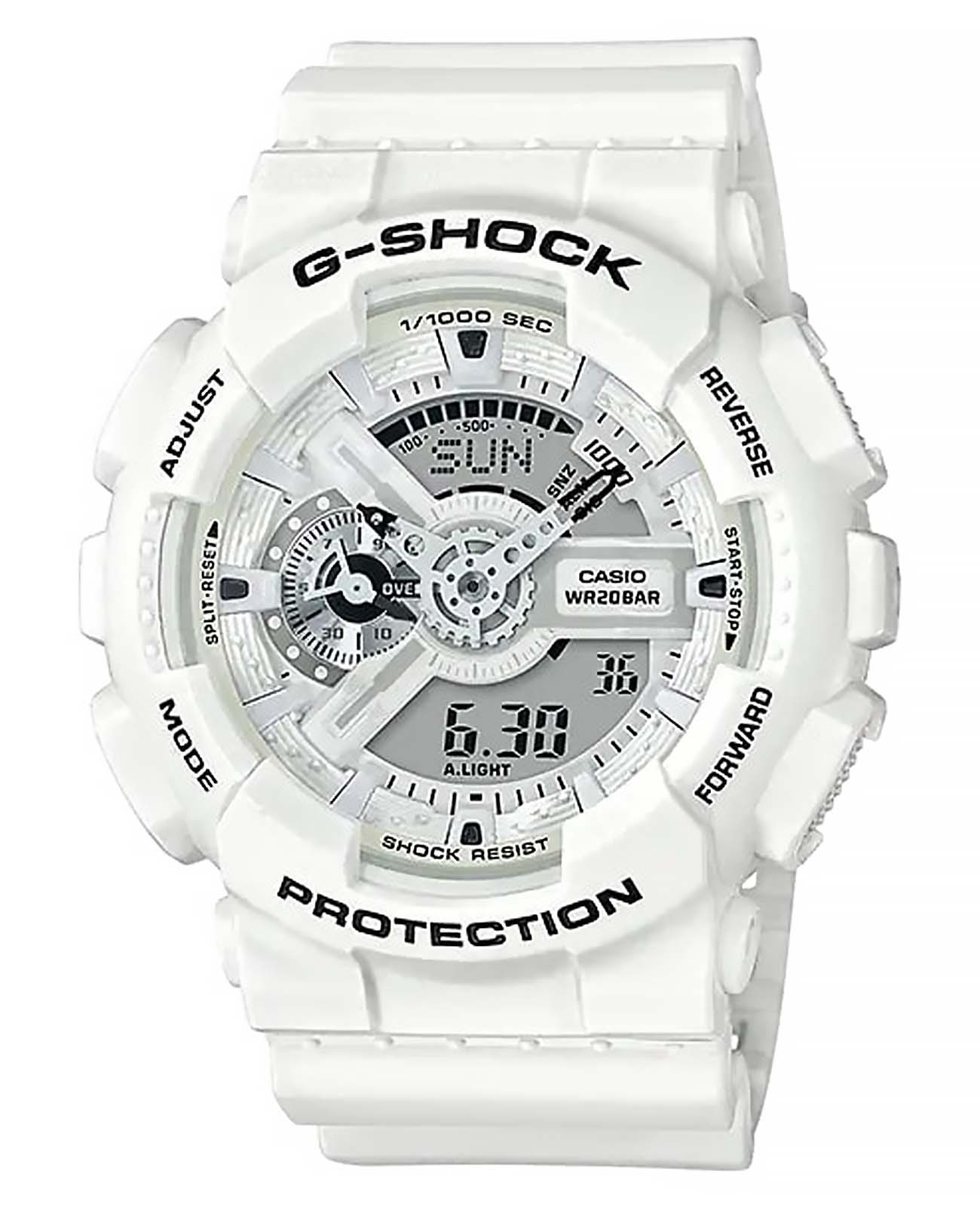 Мужские противоударные японские часы Casio G-Shock GA-110MW-7ADR (GA-110MW-7A), электронный механизм с высокой точностью. Класс водозащиты: 200 метров, позволит плавать, нырять и заниматься другими водными видами спорта. Корпус часов изготовлен из пластика, белого цвета.