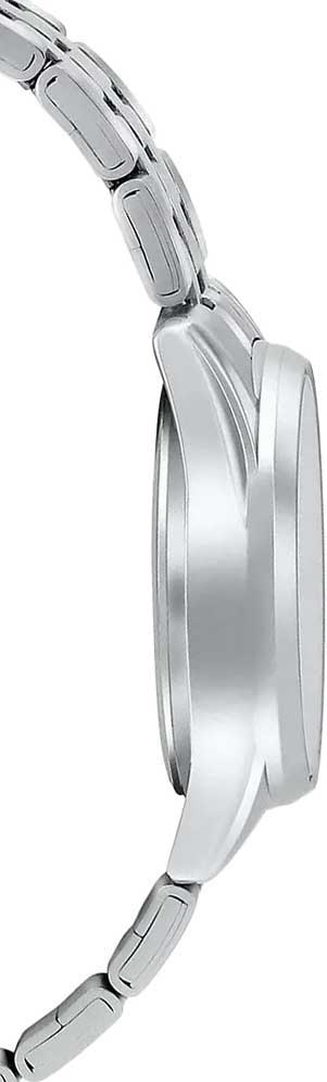 Циферблат дополнен лаконичным узором, часы отлично смотрятся в дополнении к повседневному образу. Циферблат защищен минеральным стекломМинеральное стеклоМинеральное стекло представляет собой искусственно выращенный минерал кварца. Такое стекло отличается особой устойчивостью к повреждениям и царапинам. Уступает по некоторым качествам сапфировому стеклу.. Полезными опциями являются отображение даты и дня недели, люминесцентная подсветкаЛюминесцентное покрытиеПозволяет считывать показания времени в темноте. Производители наносят на стрелки, часовые индексы, безель или поверхность циферблата светонакопительный состав, дающий холодное свечение.. Японский кварцевый механизм обеспечивает высокую точность хода +/- 20 сек/мес. Модель сделана из нержавеющей стали. Браслет с раскладной застёжкойРаскладная застёжкаТакой тип застёжки используется только на браслетах из металла. Она никогда не раскрывается полностью, происходит разделение на 2 и более частей. Раскладывающая застёжка снизит вероятность потери часов к минимуму..