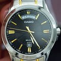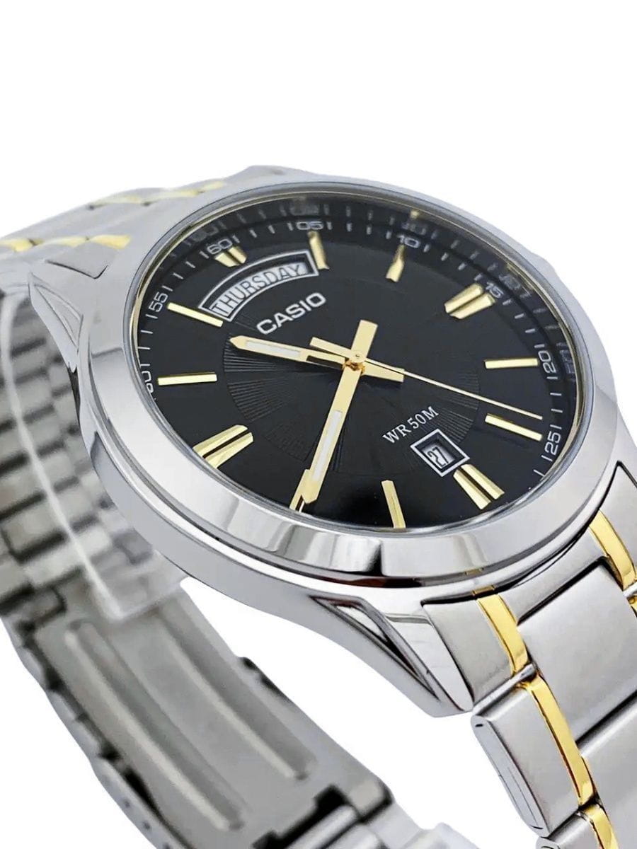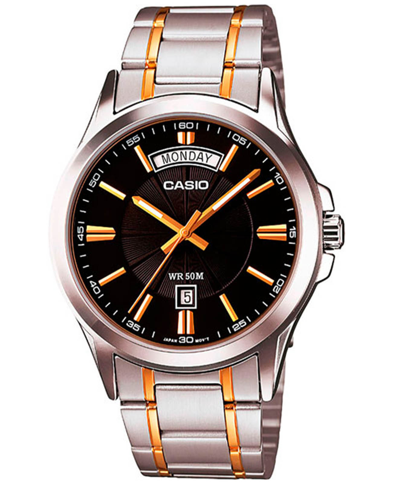 Японские мужские наручные часы с минеральным стекломМинеральное стеклоМинеральное стекло представляет собой искусственно выращенный минерал кварца. Такое стекло отличается особой устойчивостью к повреждениям и царапинам. Уступает по некоторым качествам сапфировому стеклу. Casio MTP-1381G-1A, кварцевый механизм с высокой точностью. Класс водозащиты: 50 метров, позволит защитить корпус от случайных брызг или капель дождя. Корпус часов изготовлен из стали. Стальной браслет на раскладной застёжкеРаскладная застёжкаТакой тип застёжки используется только на браслетах из металла. Она никогда не раскрывается полностью, происходит разделение на 2 и более частей. Раскладывающая застёжка снизит вероятность потери часов к минимуму. с IP-покрытиемIP-покрытиеМетод ионного напыления. Демонстрирует повышенную устойчивость к истиранию, окислению и химическим веществам. Под воздействием высокого давления и температуры около 1500°C молекулы металла надёжно соединяются с частицами корпуса часов.. Окошко даты находится в положении 6 часов.
