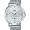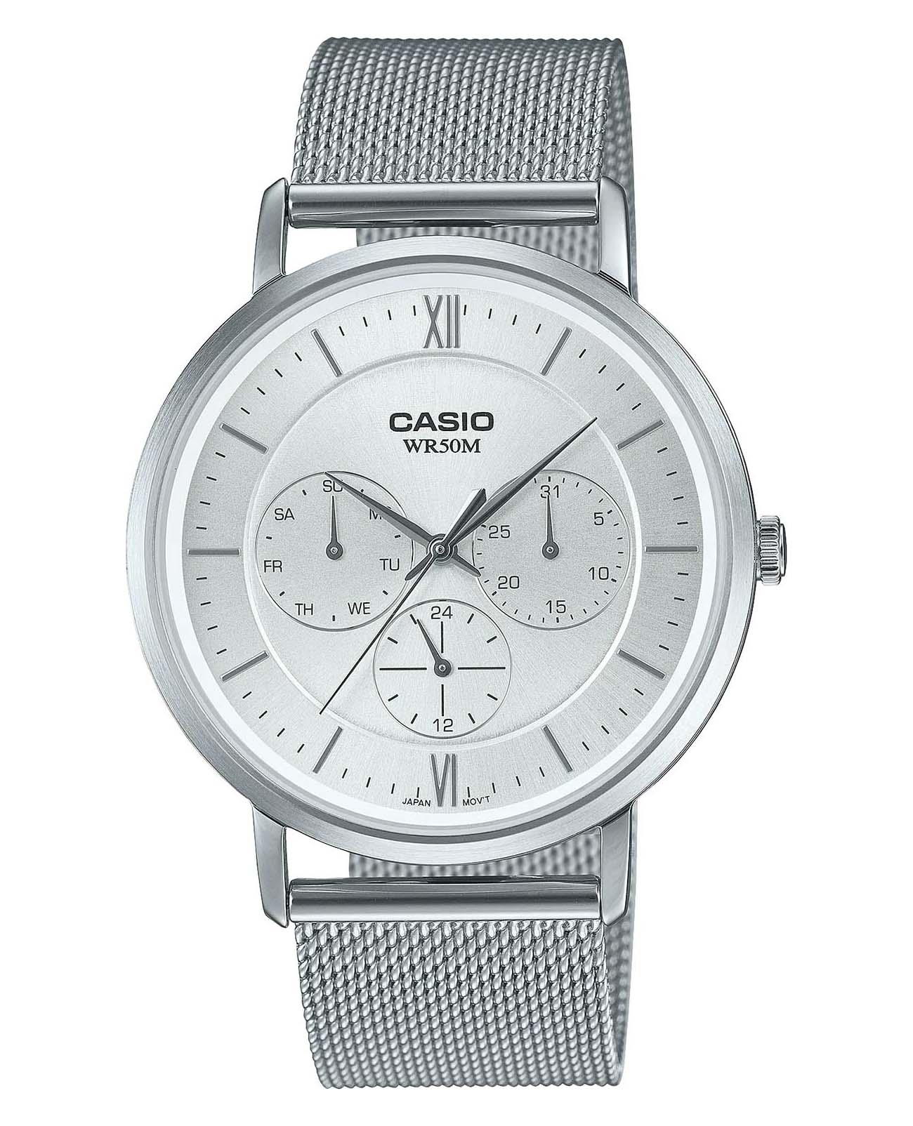 Японские мужские наручные часы Casio Collection MTP-B300M-7A, кварцевый механизм с высокой точностью. Класс водозащиты: 50 метров, позволит защитить корпус от случайных брызг или капель дождя. Корпус часов изготовлен из стали, серебристого цвета. 12-ти и 24-х часовой формат времени, число и день недели вынесены на отдельные циферблаты. Метки в виде штрихов и двух римских цифр. Батарея рассчитана на 2 года.