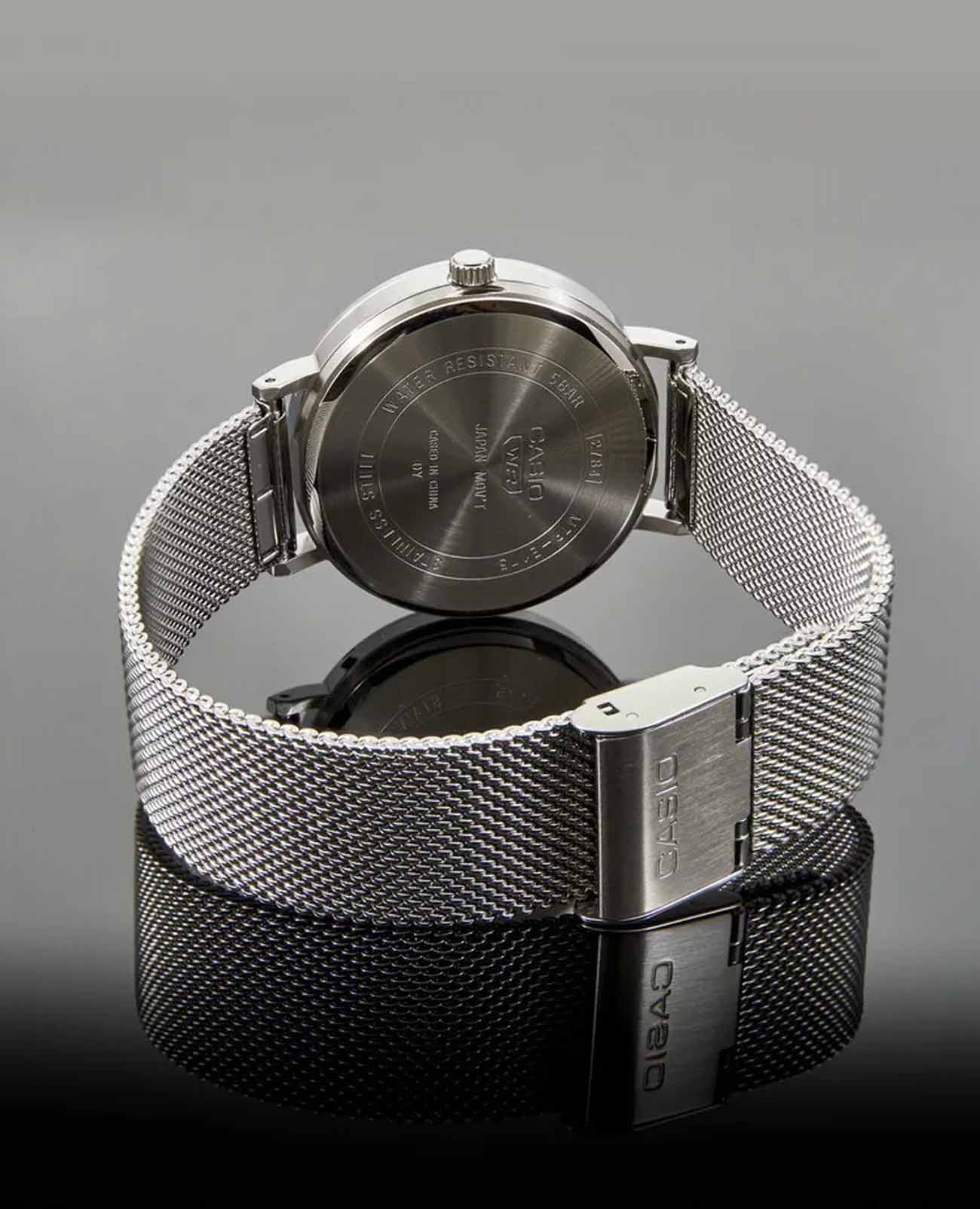 Японские мужские часы с минеральным стекломМинеральное стеклоМинеральное стекло представляет собой искусственно выращенный минерал кварца. Такое стекло отличается особой устойчивостью к повреждениям и царапинам. Уступает по некоторым качествам сапфировому стеклу. Casio Collection MTP-E175MB-2E, кварцевый механизм с высокой точностью. Корпус часов изготовлен из стали. Циферблат с метками в виде штрихов. Окошко даты находится в положении 3 часа. Рифленая заводная головка. Класс водозащиты: 50 метров, позволит защитить корпус от случайных брызг или капель дождя. Стальной браслет миланского плетения на раскладном замкеРаскладной замокДанный вариант застежки используется только на часах с металлическим браслетом. Отличительная особенность такого крепления в том, что длина браслета становится универсальной и вы можете самостоятельно отрегулировать нужный вам размер – застежка просто двигается по браслету часов..