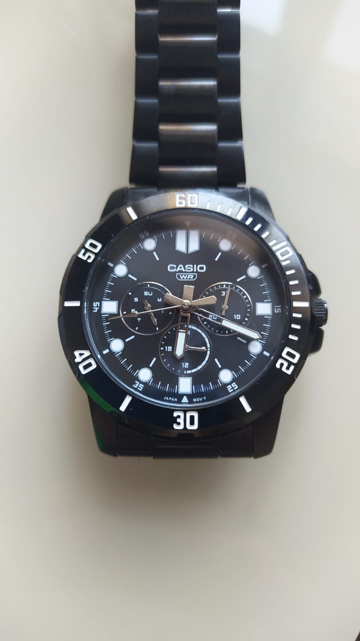 Отличная модель часов, которая станет идеальным вариантом на каждый день. Японские мужские часы с минеральным стекломМинеральное стеклоМинеральное стекло представляет собой искусственно выращенный минерал кварца. Такое стекло отличается особой устойчивостью к повреждениям и царапинам. Уступает по некоторым качествам сапфировому стеклу. Casio Collection MTP-VD300B-1E, кварцевый механизм с высокой точностью. Корпус часов и браслет изготовлены из стали с IP-покрытиемIP-покрытиеМетод ионного напыления. Демонстрирует повышенную устойчивость к истиранию, окислению и химическим веществам. Под воздействием высокого давления и температуры около 1500°C молекулы металла надёжно соединяются с частицами корпуса часов.. Люминесцентная покрытиеЛюминесцентное покрытиеПозволяет считывать показания времени в темноте. Производители наносят на стрелки, часовые индексы, безель или поверхность циферблата светонакопительный состав, дающий холодное свечение.. 12-ти и 24-х часовой формат времени, число и день недели вынесены на отдельные циферблаты. Метки в виде штрихов и точек. Заводная головка с защитой.Браслет с раскладной застёжкойРаскладная застёжкаТакой тип застёжки используется только на браслетах из металла. Она никогда не раскрывается полностью, происходит разделение на 2 и более частей. Раскладывающая застёжка снизит вероятность потери часов к минимуму..